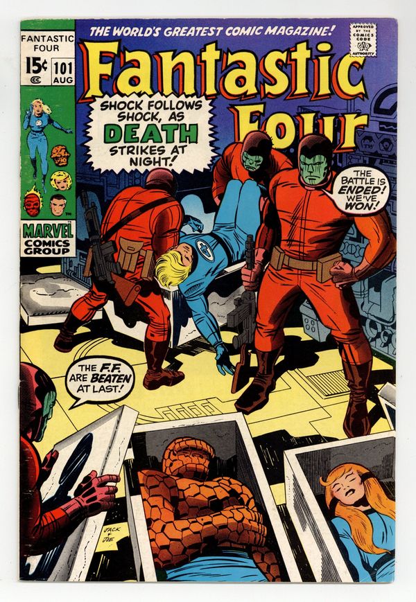 "Bedlam at the Baxter Building!" Script by Stan Lee. Pencils by Jack Kirby. Inks by Joe Sinnott. Cover by Jack Kirby and Joe Sinnott. The first 100 issues of the World's Greatest Comic Magazine are in the books! And the next one hundred begin with a threat from the Maggia! The deadly crime syndicate has somehow bought the Baxter Building, and now the misguided mobsters want to evict the FF! But the Fantastic Four aren't giving up their headquarters without a fight! When the Maggia hoodlums invade the building; Reed, Sue, Ben, Johnny, and Crystal strike back! Cameo appearances by Alicia Masters and Franklin. (Notes: This issue was reprinted in Fantastic Four 180. The letters page includes letters from comics writer J.M. DeMatteis and comics artist Alan Kupperberg, respectively. This issue includes a half-page ad for Astonishing Tales 1 featuring Doctor Doom and Ka-Zar.) 36 pages Cover price $0.15.