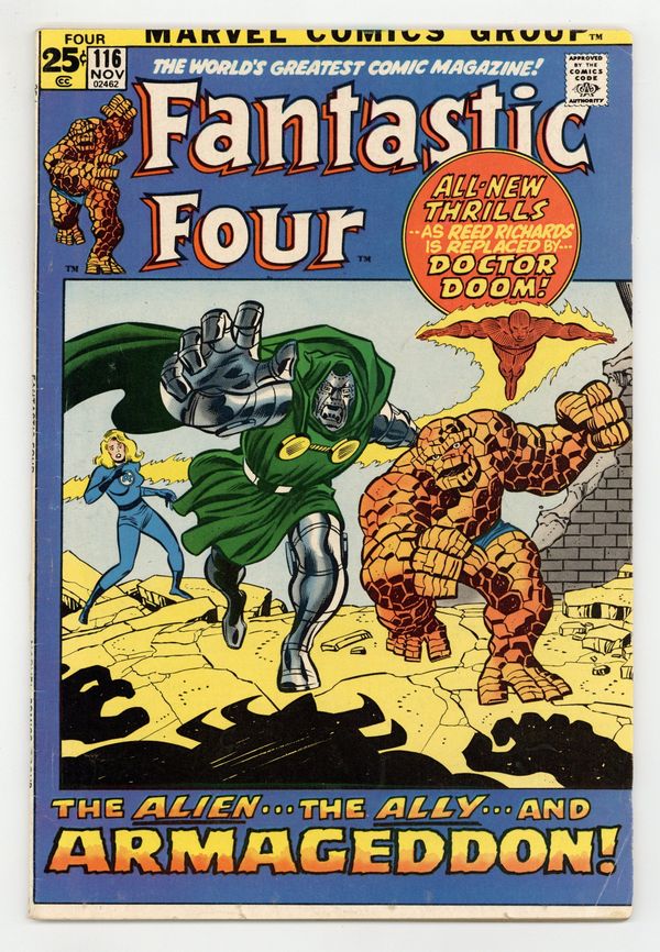 52-page giant issue. "The Alien, the Ally, and Armageddon!" Part 4 of 4. Script by Archie Goodwin. Pencils by John Buscema. Inks by Joe Sinnott. Cover by John Buscema and Joe Sinnott. The Over-Mind is in supreme control! And with Mr. Fantastic by his side, he's set to conquer the Earth! However, Sue, Ben, and Johnny are not giving up! The Thing and Torch bravely attack the Over-Mind one more time, but are defeated again. When the Invisible Girl sees her friends fall, she knows she must find other super-heroes to help! But the Avengers aren't home, and there's no sign of Spider-Man or Daredevil or Prince Namor or even the Hulk! Is anyone else available? Unfortunately, no super-heroes, but what about a super-villain? And one from Latveria no less? Desperate times call for desperate measures...and in stunning fashion Doctor Doom joins the Fantastic Four to battle the near omnipotent Over-Mind! Can Victor Von Doom and his long-time adversaries turn the tide against the Over-Mind? Or will they need help from a stranger? A bronze age classic! Cameo appearances by Jarvis, Agatha Harkness, Franklin, the Watcher, and the Stranger. (Notes: Doctor Doom appears next in Sub-Mariner 47. The Over-Mind returns years later in Defenders 112 and 113. This issue was reprinted in Marvel ?s Greatest Comics 96. The letters page includes a letter from comics editor and writer Bob Rozakis.) 52 pages Cover price $0.25.