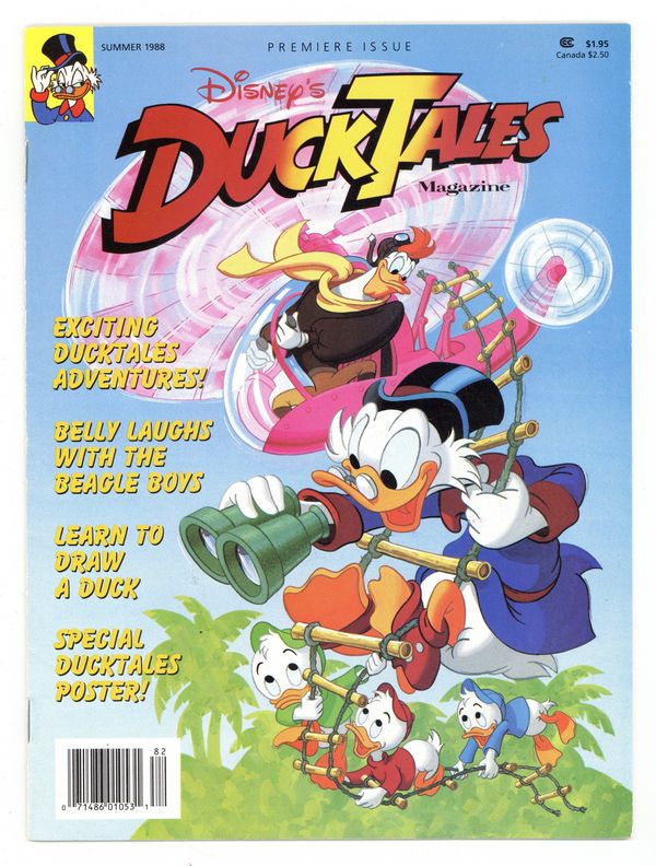 Published Jun 1988 by Welsh Publishing Group.$36.00Issue #1 - Summer 1988. Contents include "The Puzzle of the Lost Pyramid" comic story, jokes, activities, how to draw the ducks, color centerfold poster of the Beagle Boys chasing Huey and Dewey through a jungle, text story featuring Webby, and a puzzle. 8" x 11", 32 pages, full color. Cover price $1.95.