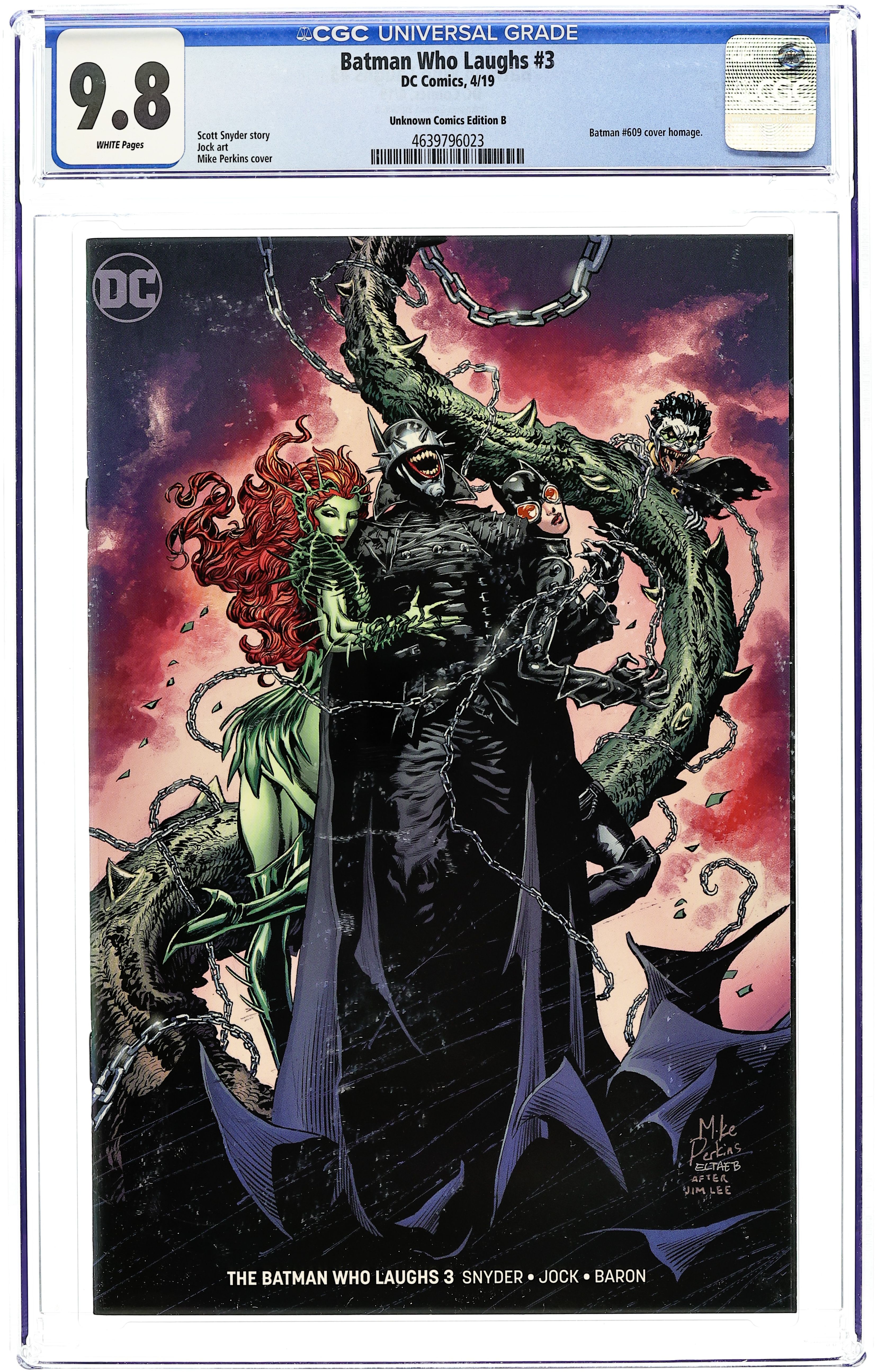 Unknown Comics exclusive variant by Mike Perkins. Written by Scott Snyder. Art by Jock. All the pieces are starting to fit together as the Batman Who Laughs acquires another key element in his plan-one that is linked to the founding fathers of Gotham City and to a legacy started by the Wayne family and protected by none other than Oswald Cobblepot. While the Penguin goes head-to-head with the darkest version of his mortal enemy, Batman is forced to compromise his principles and purge the serum that protects his heart from the deadly Joker Toxin! It's a no-win situation as writer Scott Snyder and artist Jock return to the sociopath they created in 'Black Mirror': James Gordon Jr. 32 pages, full color. RATED T+