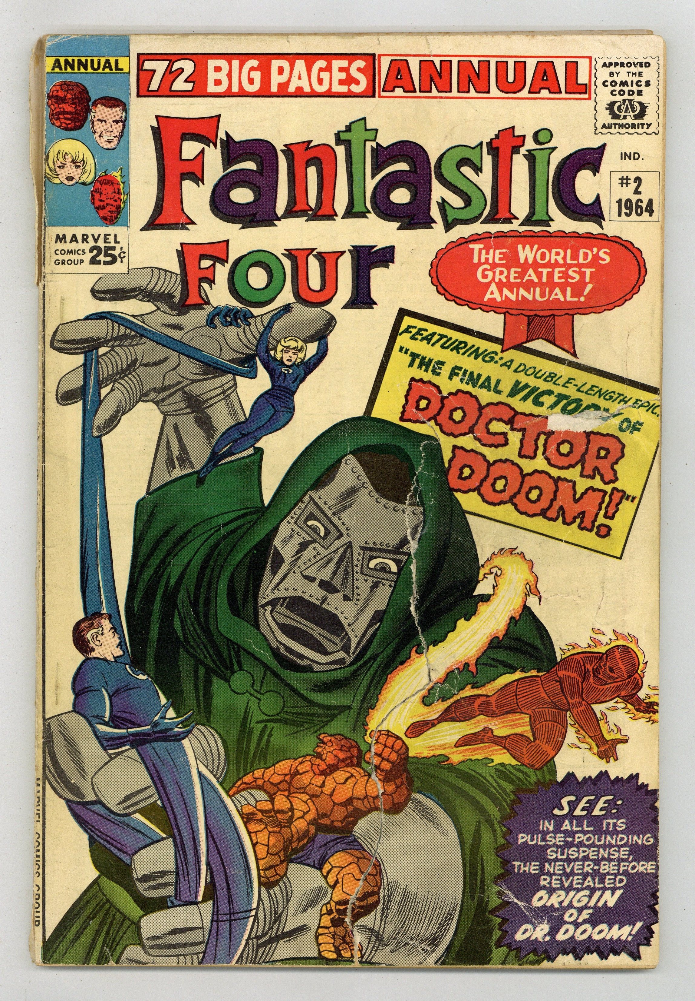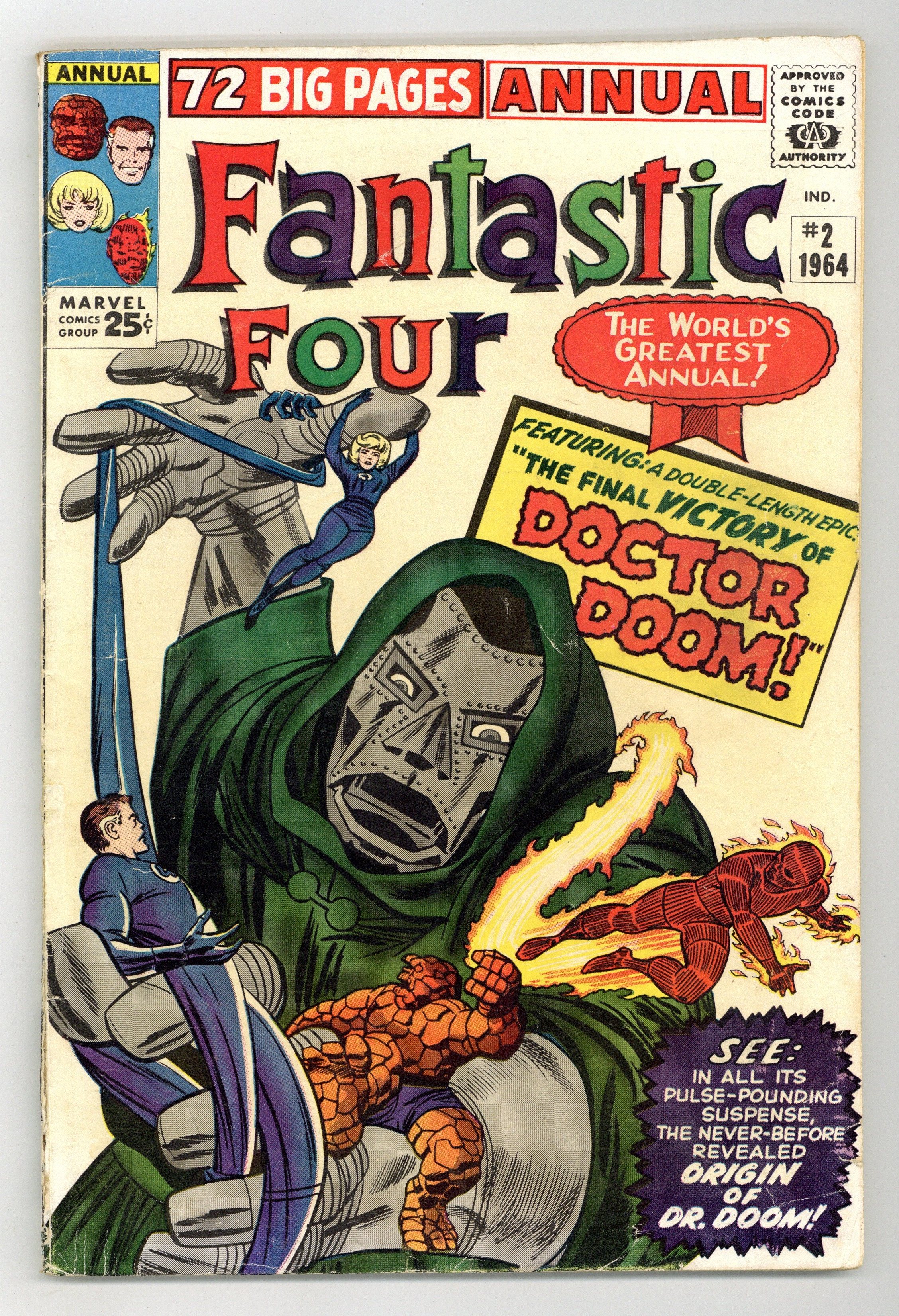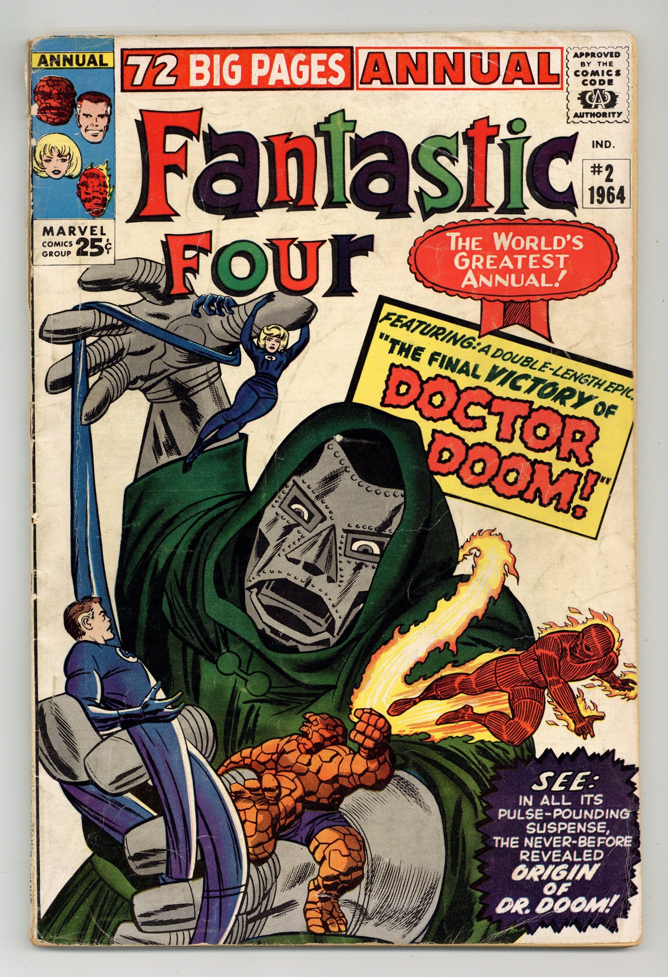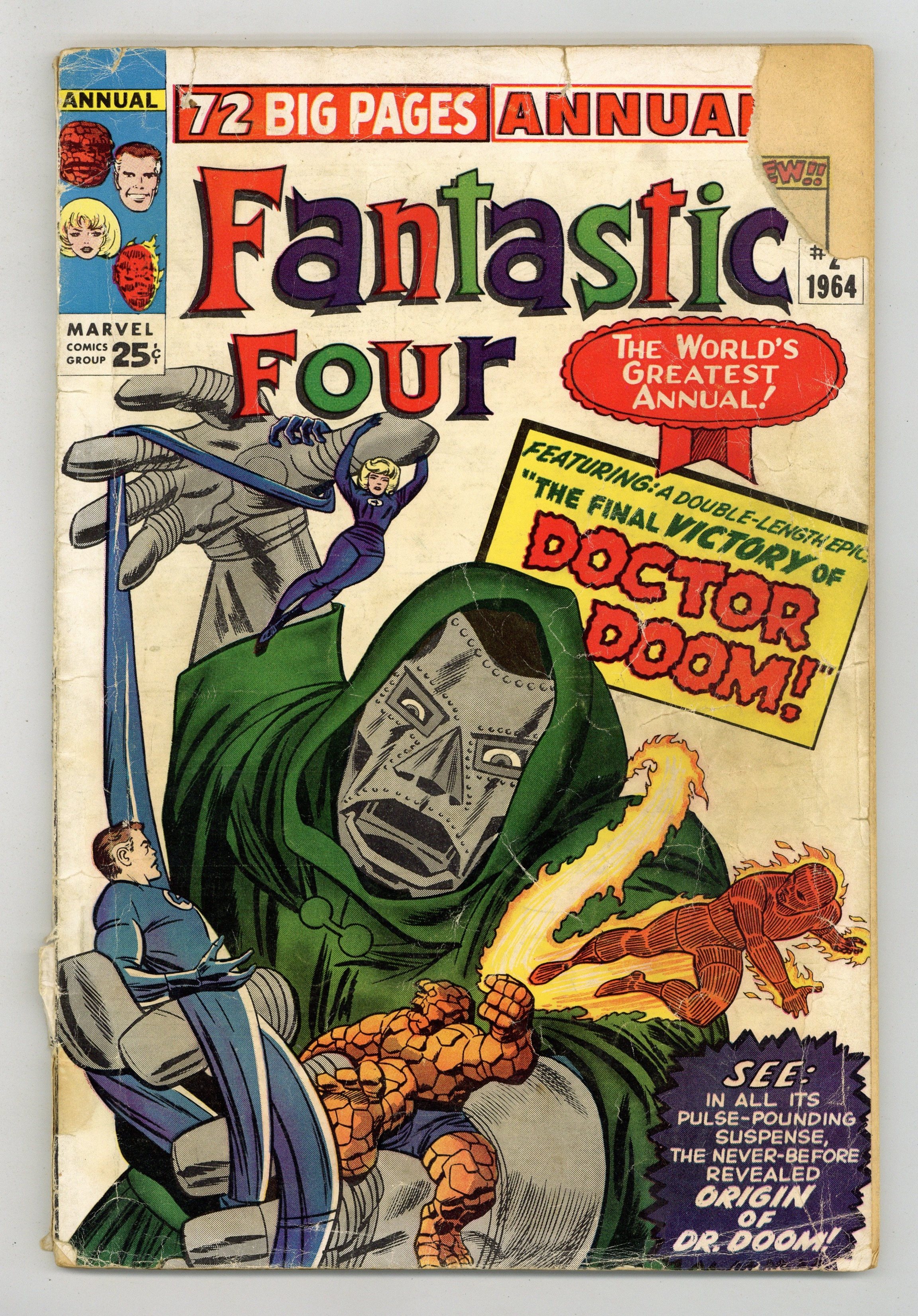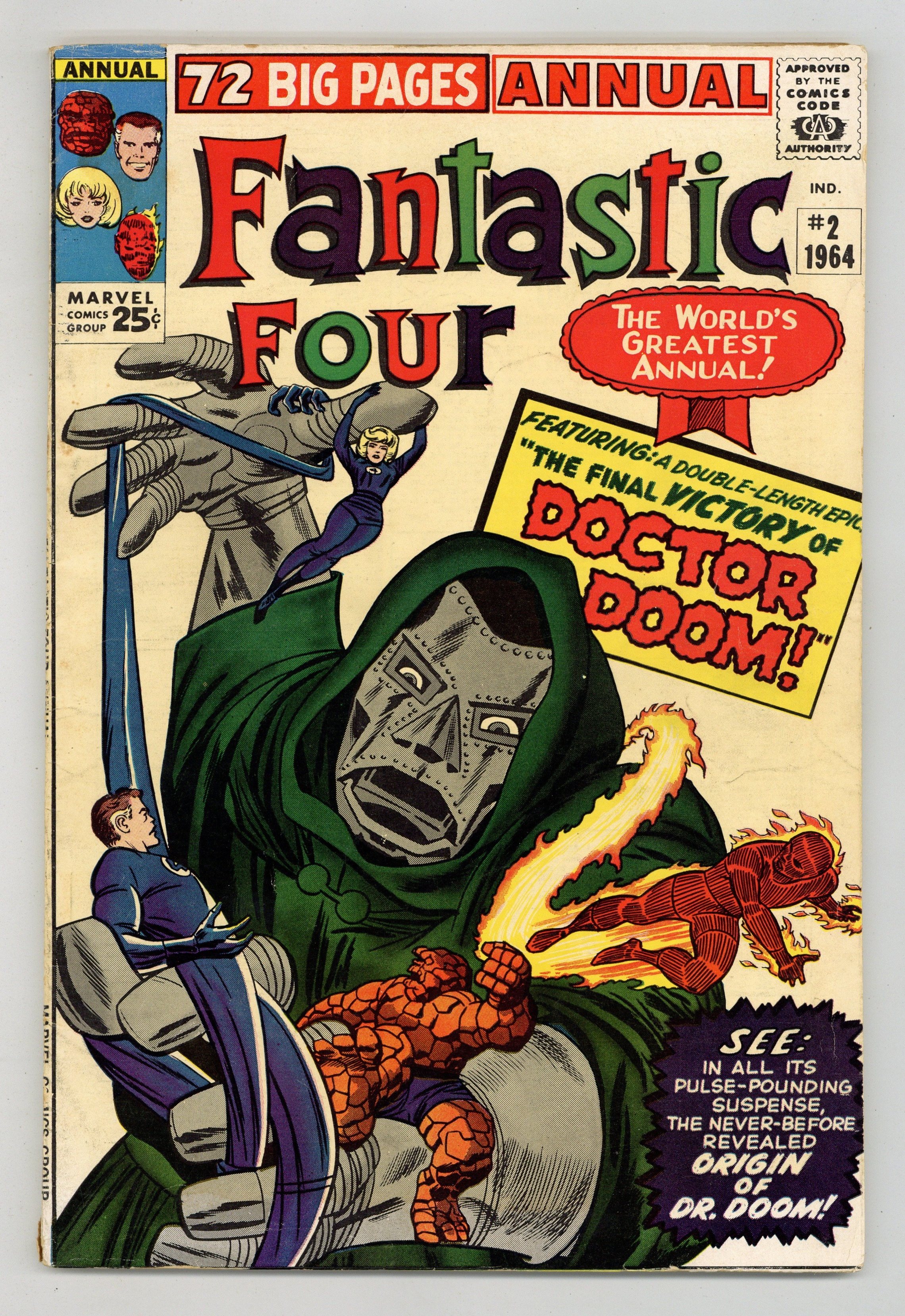 2 new Doctor Doom stories, "Origin of Doctor Doom!" and "The Final Victory of Dr. Doom!" Scripts by Stan Lee, pencils by Jack Kirby, inks by Chic Stone. Six pages of pin-ups by Kirby/Sol Brodsky. This issue also reprints "Prisoners of Doctor Doom" (from FF 5). Kirby/Stone cover. 76 pgs. Cover price $0.25.