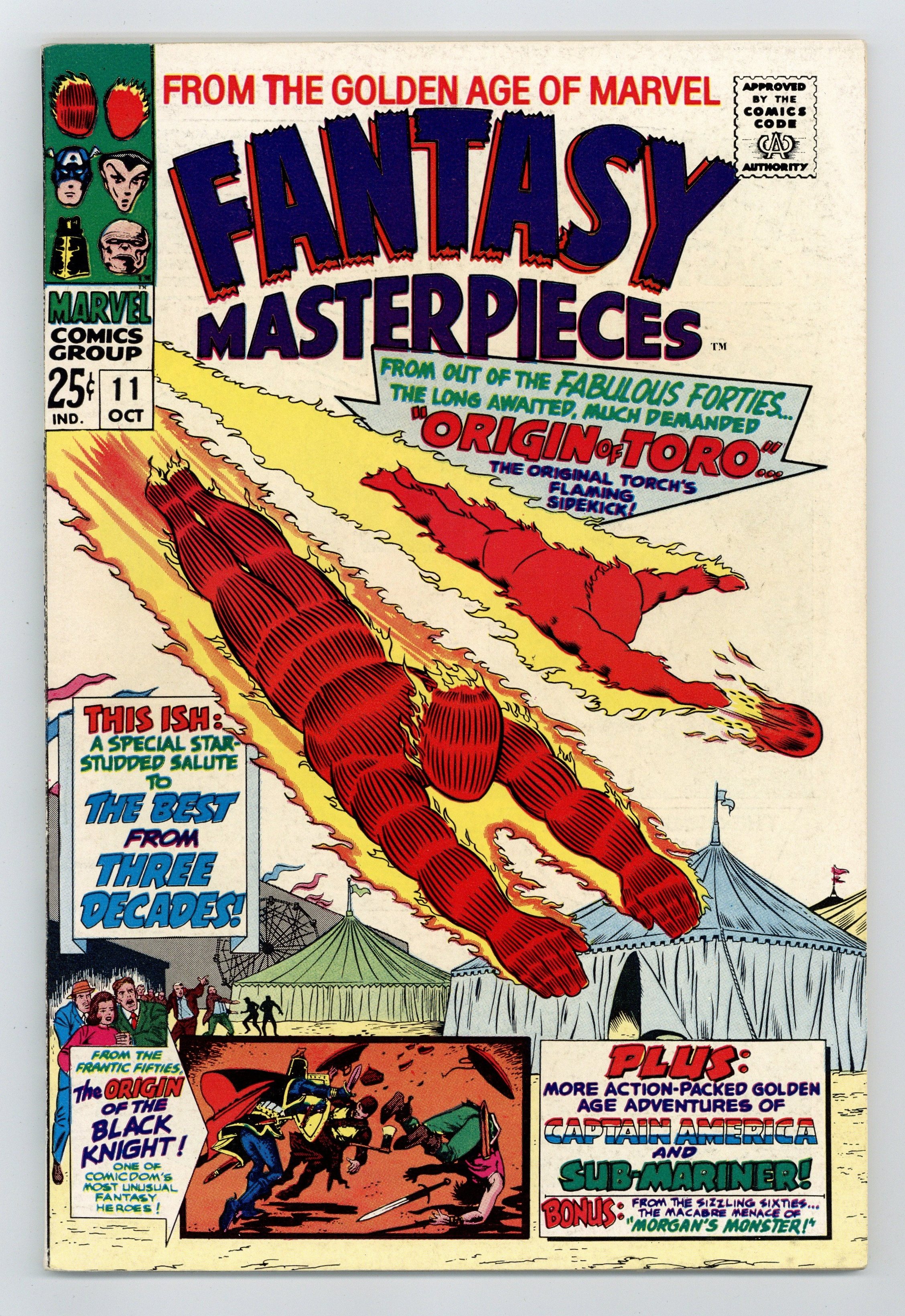 Reprinting: "Introducing Toro the Flaming Torch Kid" from Human Torch #1 (1940), A Sub-Mariner story from Sub-Mariner #34, "The Menace Of Morded The Evil" from Black Knight #1 (1955), "Mister Morgan's Monster" from Strange Tales #99, and "Hotel Of Death" from Captain America Comics #10. Cover price $0.25.