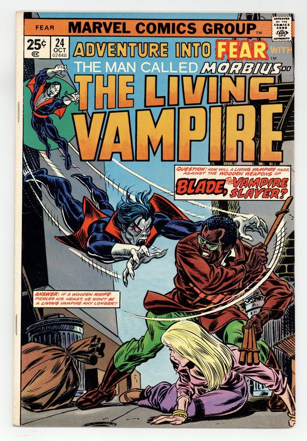 $72.00Morbius battles Blade the Vampire Slayer in "Return to Terror!" Script by Steve Gerber, pencils by Craig Russell, inks by Jack Abel. The letters page contains Marvel Value Stamp series A # 38 (Red Sonja by Barry Windsor-Smith). Reprint back-up story: "The Two-Faced Man" with art by Joe Maneely (from World of Suspense 1). Gil Kane cover pencils (John Romita Sr. inks?). Cover price $0.25.