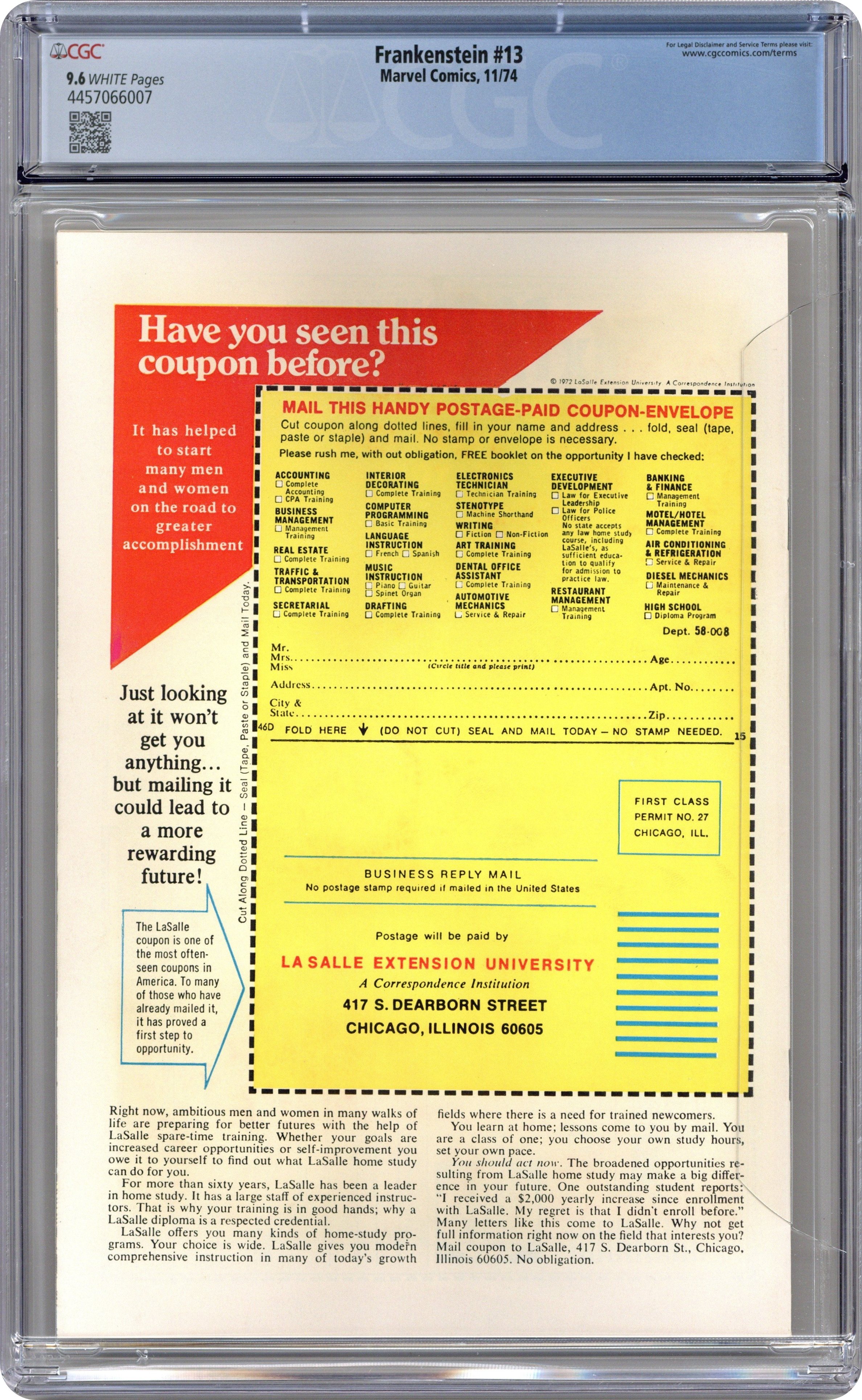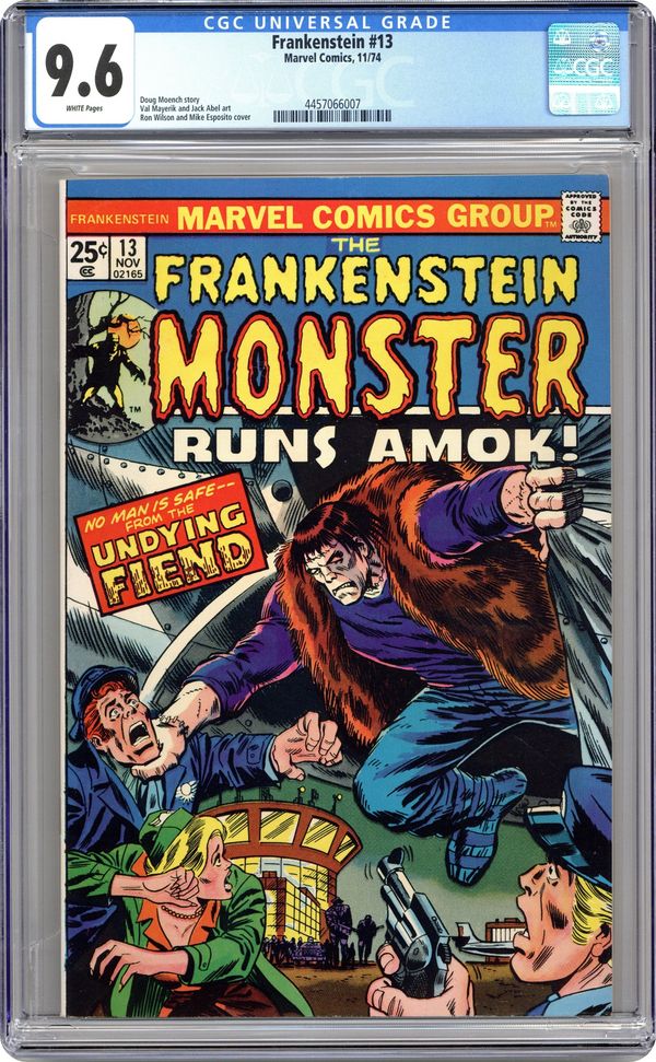 Cover pencils by Ron Wilson, inks by Mike Esposito and Frank Giacoia. All Pieces of Fear!, script by Doug Moench, pencils by Val Mayerik, inks by Jack Abel; After being attacked by a street gang, the Frankenstein Monster is befriended by Ralph Caccone. Six Strange Words, art by Syd Shores; A thug threatens a sorcerer to tell him six words which allow him to send a man into limbo; After he uses them on the sorcerer he breaks the fourth wall and addresses the reader directly telling them they "know too much"; He speaks the incantation once again, but this time he is the one to disappear into limbo where he finds the sorcerer laughing at him. 36 pgs., full color. $0.25. Cover price $0.25.