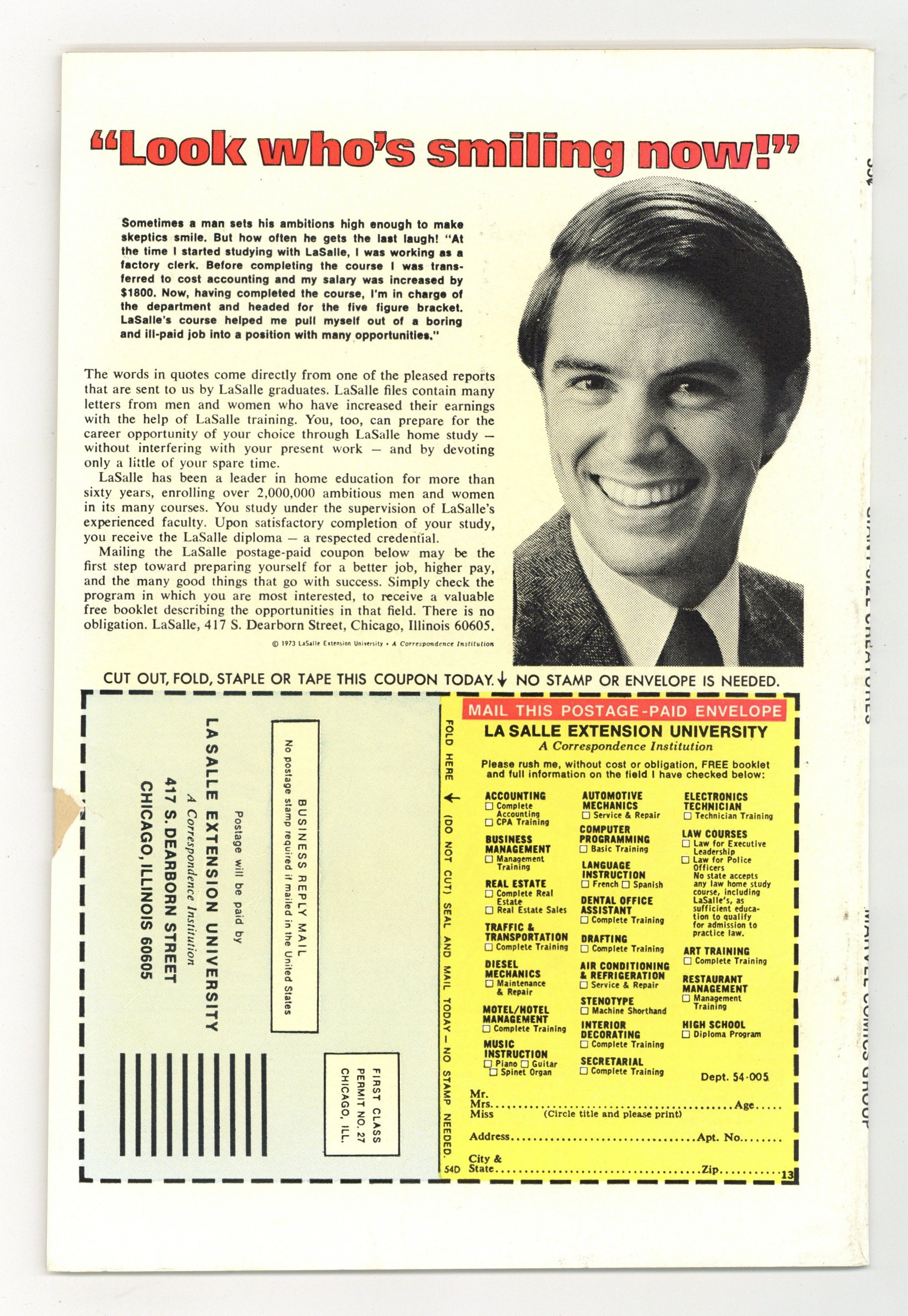 52-page giant. New story: "Tigra the Were-Woman!", script by Tony Isabella, pencils by Don Perlin, inks by Vince Colletta; Greer Nelson, formerly known as The Cat, is transformed by the Cat People into Tigra. Tigra and the Werewolf By Night free the Cat People from Hydra. "Waiter, There's a Werewolf in My Soup!" article by Roy Thomas, art by Don Perlin; Text piece detailing the origins of the Werewolf By Night strip. "Where Walks the Werewolf!" (reprinted from Creatures on the Loose #13), script by Len Wein, art by Reed Crandall; A blind man has the eyes of a wolf transplanted into himself, and becomes a werewolf. "Tigra's Year" article by Tony Isabella; Details how the ideas behind Tigra came about. Includes the original pencil design sketch of Tigra by Gil Kane. 52 pgs., full color. Cover price $0.35.