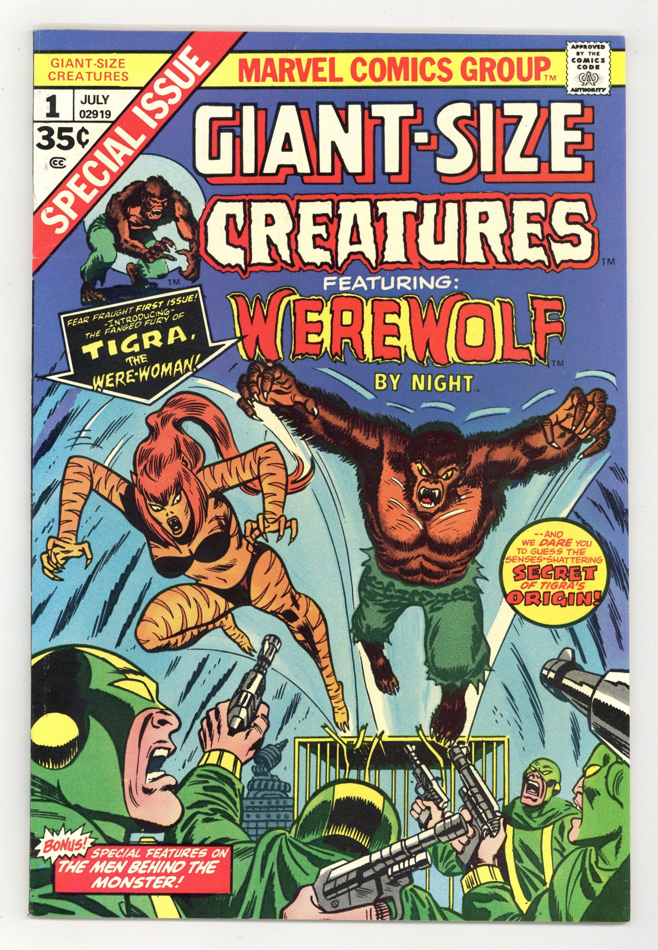 $42.0052-page giant. New story: "Tigra the Were-Woman!", script by Tony Isabella, pencils by Don Perlin, inks by Vince Colletta; Greer Nelson, formerly known as The Cat, is transformed by the Cat People into Tigra. Tigra and the Werewolf By Night free the Cat People from Hydra. "Waiter, There's a Werewolf in My Soup!" article by Roy Thomas, art by Don Perlin; Text piece detailing the origins of the Werewolf By Night strip. "Where Walks the Werewolf!" (reprinted from Creatures on the Loose #13), script by Len Wein, art by Reed Crandall; A blind man has the eyes of a wolf transplanted into himself, and becomes a werewolf. "Tigra's Year" article by Tony Isabella; Details how the ideas behind Tigra came about. Includes the original pencil design sketch of Tigra by Gil Kane. 52 pgs., full color. Cover price $0.35.
