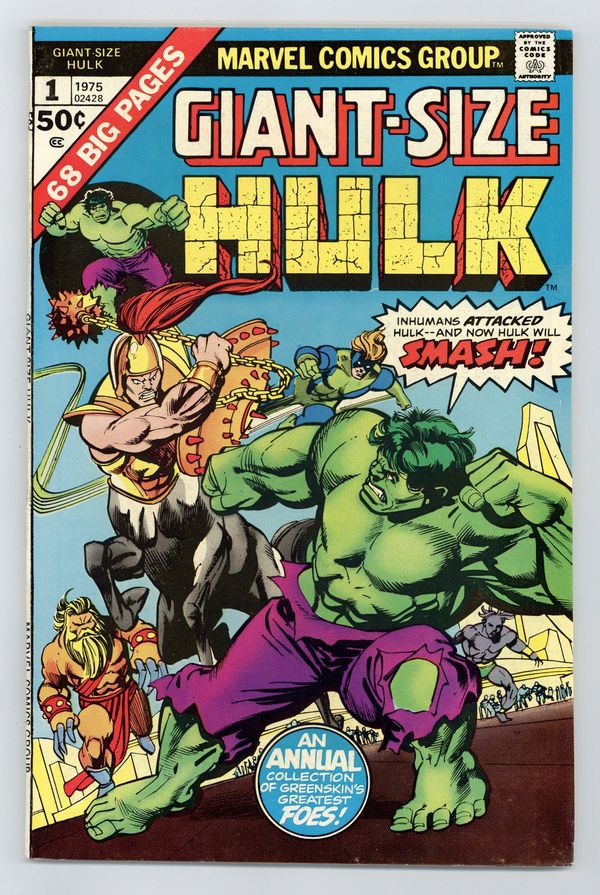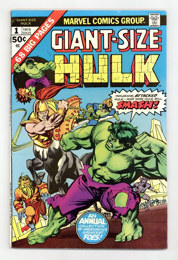 Tags: Hulk$12.00Cover pencils by Gil Kane, inks by Klaus Janson. "A Refuge Divided!", script by Gary Friedrich, pencils by Marie Severin, inks by Syd Shores and Marvel Bullpen; Black Bolt banishes six rebel Inhumans to the un-place for treason; Lockjaw takes them there but on his way back to the Great Refuge, he tangles with the Hulk whom he also takes to the un-place. Under the guidance of Maximus, the Hulk joins up with the evil Inhumans and they make their way back to the real world to remove Black Bolt from his throne; Realizing that the Hulk is an ally (after they beat on each other for awhile), Black Bolt offers to let the Hulk live in peace with the Inhumans, but the jade giant declines the offer. 68 pgs., full color. Cover price $0.50.