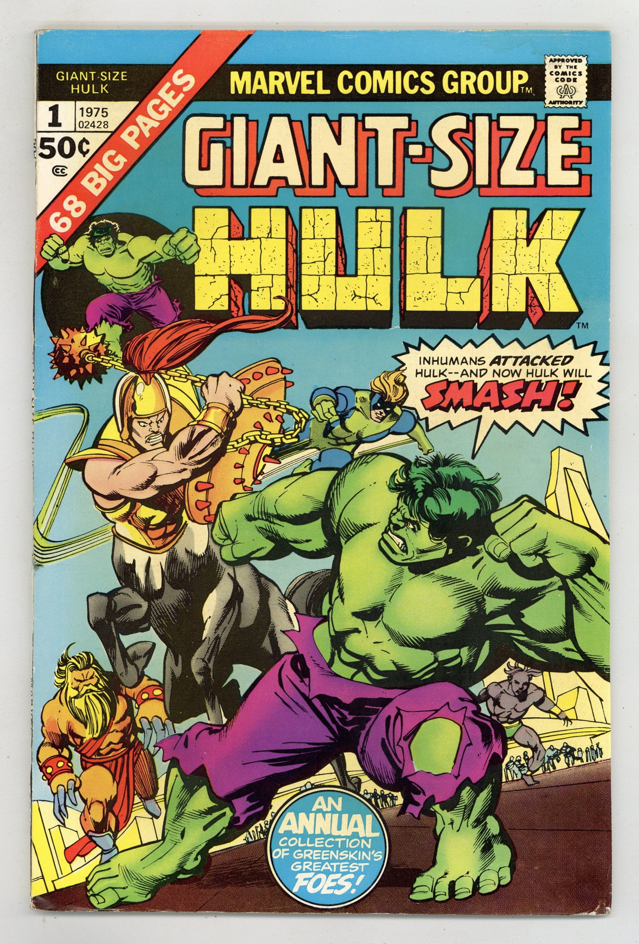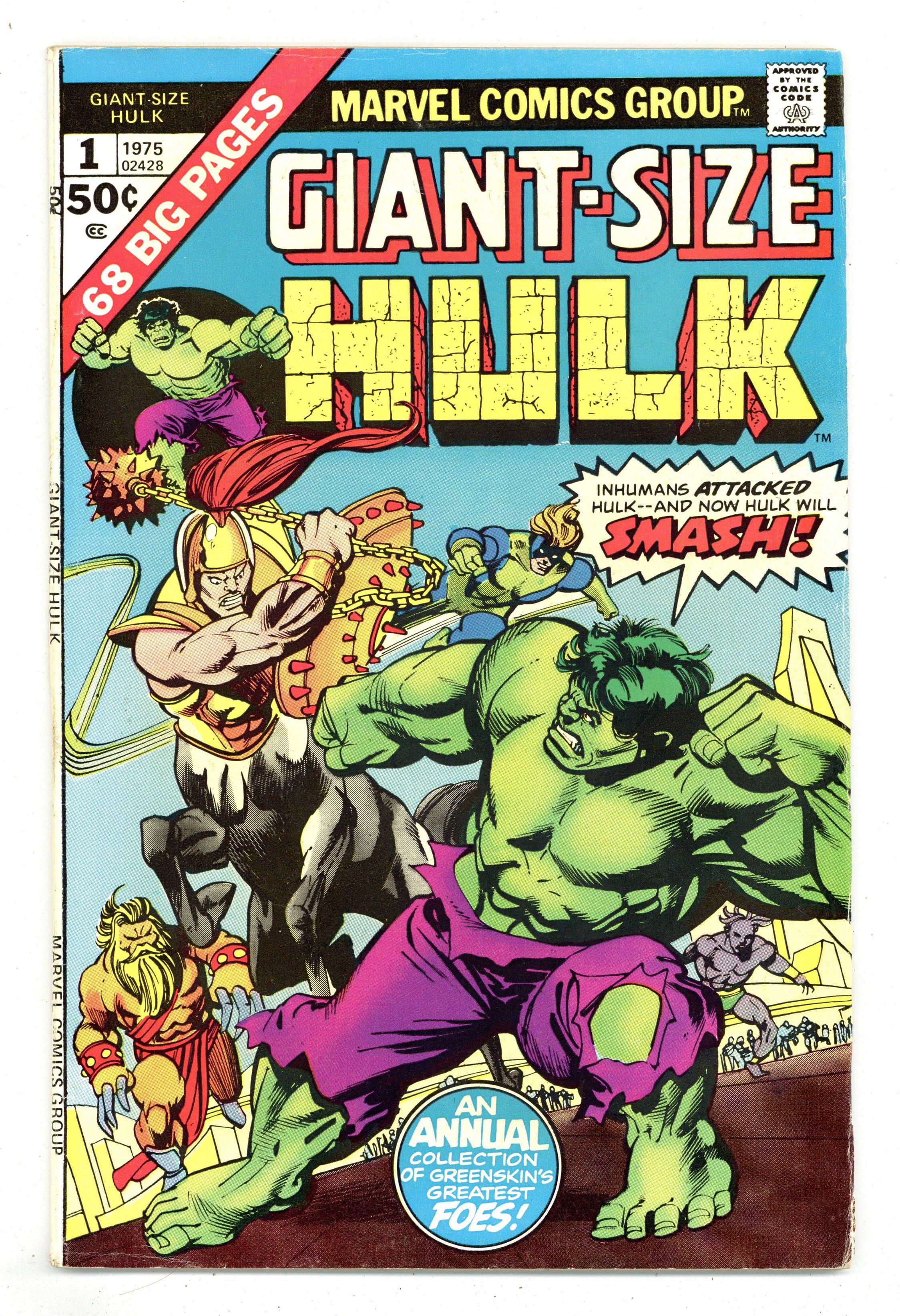 Tags: Hulk$16.50Cover pencils by Gil Kane, inks by Klaus Janson. "A Refuge Divided!", script by Gary Friedrich, pencils by Marie Severin, inks by Syd Shores and Marvel Bullpen; Black Bolt banishes six rebel Inhumans to the un-place for treason; Lockjaw takes them there but on his way back to the Great Refuge, he tangles with the Hulk whom he also takes to the un-place. Under the guidance of Maximus, the Hulk joins up with the evil Inhumans and they make their way back to the real world to remove Black Bolt from his throne; Realizing that the Hulk is an ally (after they beat on each other for awhile), Black Bolt offers to let the Hulk live in peace with the Inhumans, but the jade giant declines the offer. 68 pgs., full color. Cover price $0.50.