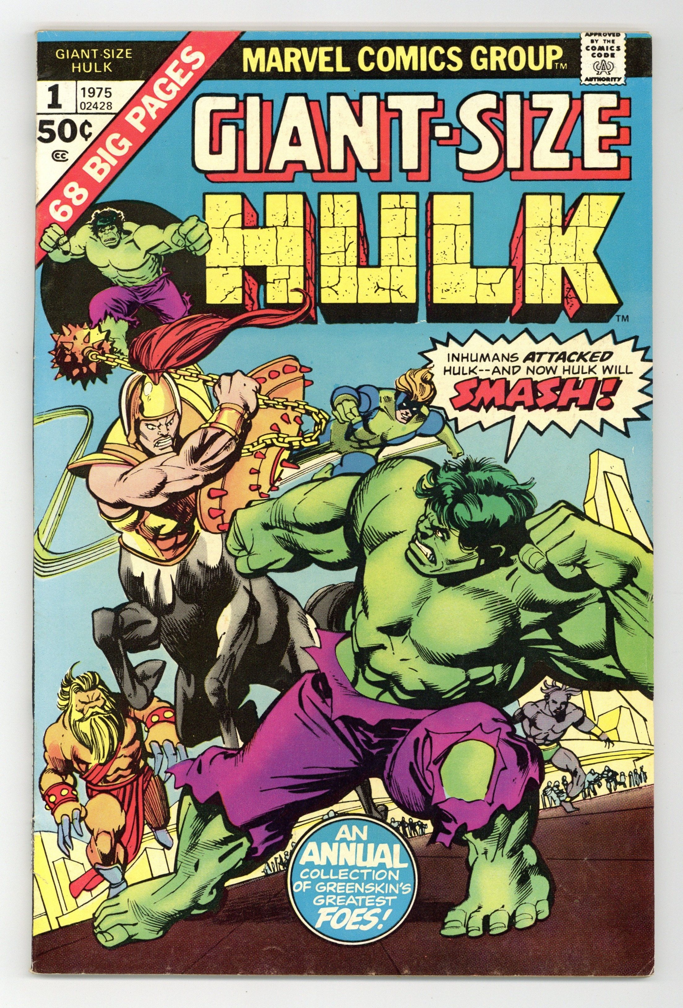 Cover pencils by Gil Kane, inks by Klaus Janson. "A Refuge Divided!", script by Gary Friedrich, pencils by Marie Severin, inks by Syd Shores and Marvel Bullpen; Black Bolt banishes six rebel Inhumans to the un-place for treason; Lockjaw takes them there but on his way back to the Great Refuge, he tangles with the Hulk whom he also takes to the un-place. Under the guidance of Maximus, the Hulk joins up with the evil Inhumans and they make their way back to the real world to remove Black Bolt from his throne; Realizing that the Hulk is an ally (after they beat on each other for awhile), Black Bolt offers to let the Hulk live in peace with the Inhumans, but the jade giant declines the offer. 68 pgs., full color. Cover price $0.50.