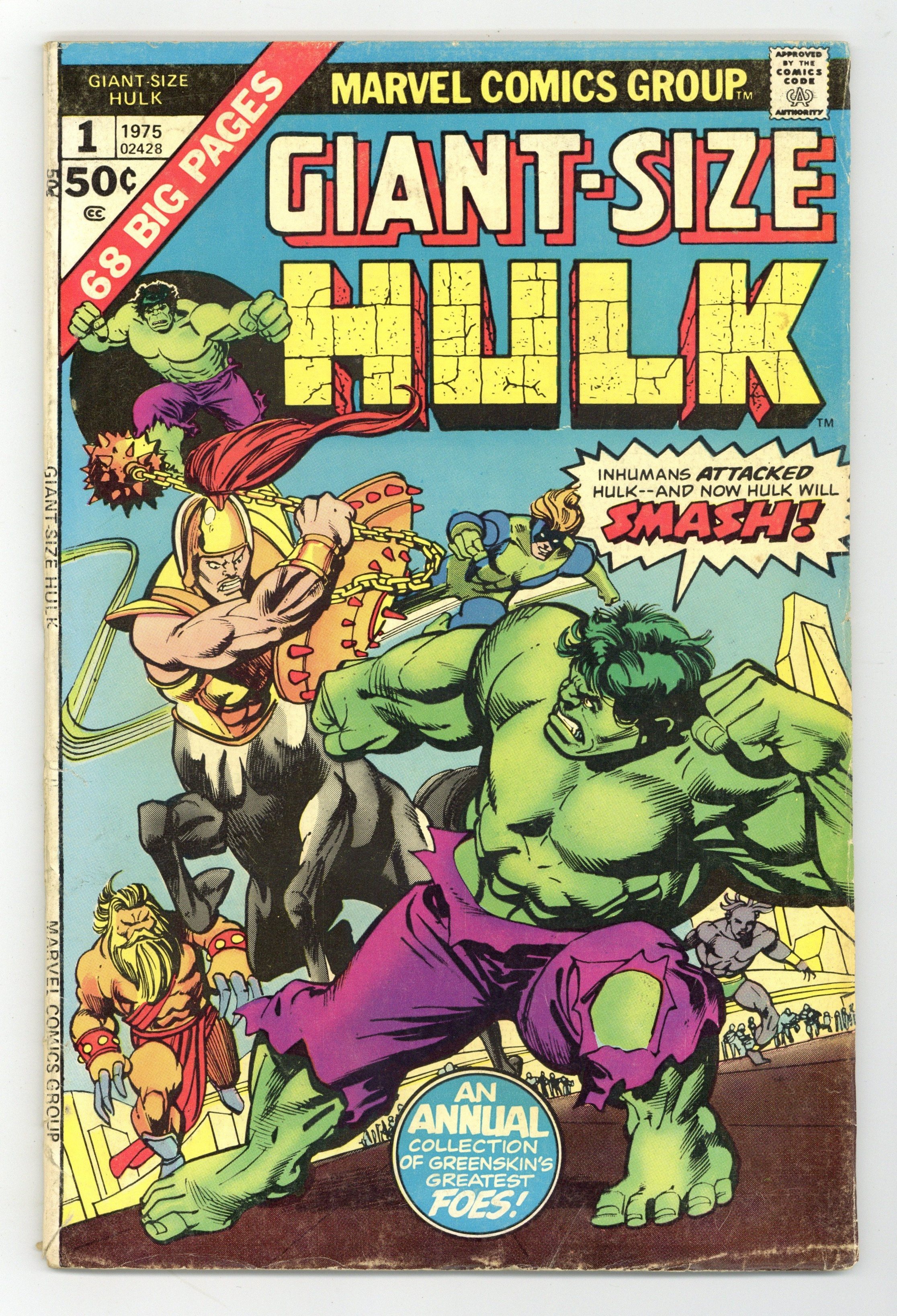 Tags: Hulk$13.00Cover pencils by Gil Kane, inks by Klaus Janson. "A Refuge Divided!", script by Gary Friedrich, pencils by Marie Severin, inks by Syd Shores and Marvel Bullpen; Black Bolt banishes six rebel Inhumans to the un-place for treason; Lockjaw takes them there but on his way back to the Great Refuge, he tangles with the Hulk whom he also takes to the un-place. Under the guidance of Maximus, the Hulk joins up with the evil Inhumans and they make their way back to the real world to remove Black Bolt from his throne; Realizing that the Hulk is an ally (after they beat on each other for awhile), Black Bolt offers to let the Hulk live in peace with the Inhumans, but the jade giant declines the offer. 68 pgs., full color. Cover price $0.50.