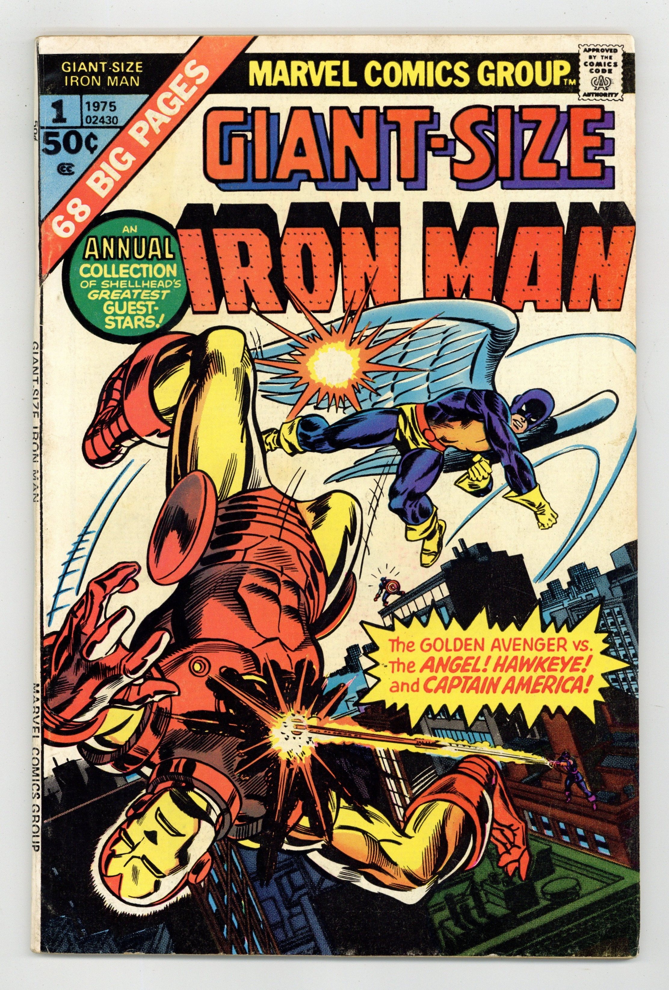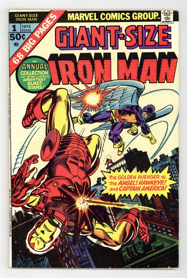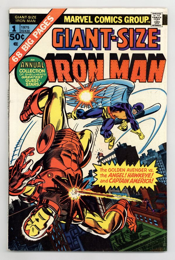 This giant-size issue features three reprint stories and a new cover by Gil Kane and Frank Giacoia. First story reprinted from Tales of Suspense 49 (minus 3 pages): "The New Iron Man Meets the Angel!" Guest-starring the original X-Men. Script by Stan Lee. Pencils by Steve Ditko. Inks by Paul Reinman. The Angel is caught in the blast of an atomic explosion at Stark Industries! And now the disoriented Angel wants to leave the X-Men and join the evil mutants instead! It's up to Shell-head to convince him to change his mind! Cameo appearance by the original Avengers. Second story reprinted from Tales of Suspense 57: "Hawkeye, the Marksman!" Guest-starring Hawkeye (first appearance) and the Black Widow. Script by Stan Lee. Art by Don Heck. Iron Man battles the future ace archer of the Avengers: Hawkeye! Third story reprinted from Tales of Suspense 58: "In Mortal Combat with Captain America!" Guest-starring Captain America. Script by Stan Lee. Pencils by Don Heck. Inks by Dick Ayers. The Chameleon tricks Cap and the golden avenger into fighting one another! Cameo appearances by Kraven the Hunter, Giant-Man, and the Wasp. 64 pages. 50 cent cover price. Cover price $0.50.