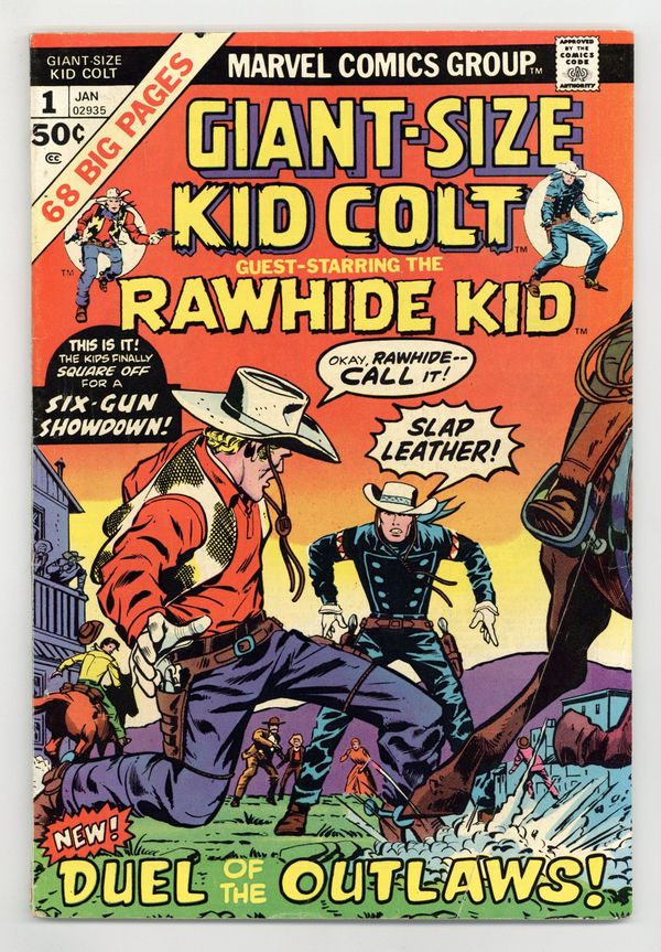 Kid Colt and the Rawhide Kid in a new story, "Meet the Manhunter" (script and pencils by Larry Lieber, inks by Vince Colletta). Also in this issue: three untitled Kid Colt reprints (from issue 52) with art by Jack Keller; three Kid Colt stories from issue 62: "Duel to the End" (art by Dick Ayers), "Beware the Gunman" (art by John Severin), and "The Dam" (art by Keller). Plus: "The Ramrod" (from issue 52; art by Gene Colan). Cover price $0.50.