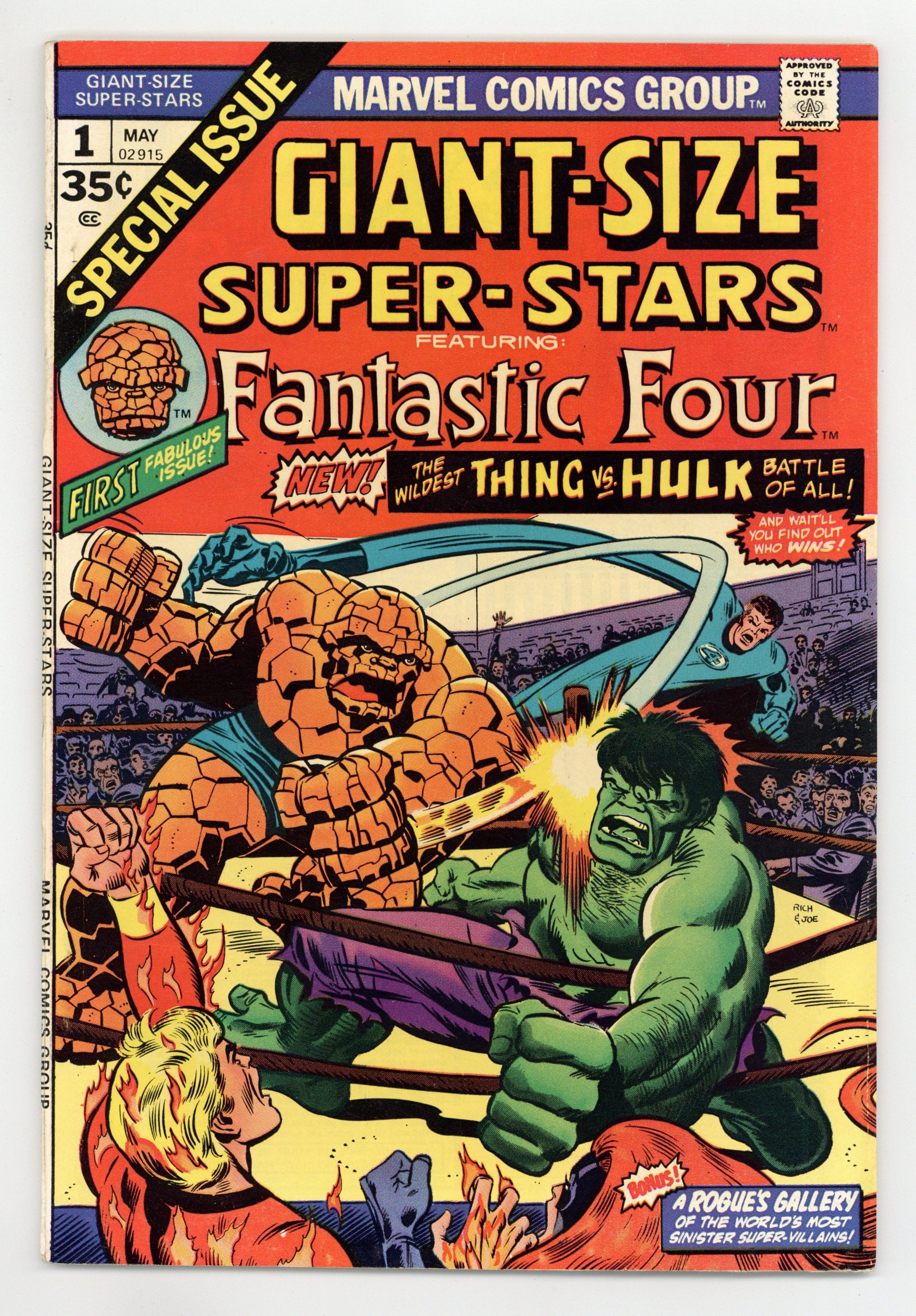48-page giant. "The Mind of the Monster!" Guest-starring the Fantastic Four, the Hulk, and Thundra. Story by Gerry Conway. Art by Rick Buckler and Joe Sinnott. Bruce Banner visits the Baxter Building and devises a plan to turn the Thing back in Ben Grimm and also rid himself of the Hulk forever. But something goes wrong...and a brand new Hulk vs. Thing battle erupts! Fantastic Four members: Mr. Fantastic, Human Torch, Medusa, and the Thing. This issue includes a 4-page write-up from Roy Thomas describing the format and next story planned for the Giant-Size series. This issue also contains a 7-page rogues' gallery of famous FF foes. (Note: The title of the series changes to Giant-Size Fantastic Four for the next issue.) Cover price $0.35.