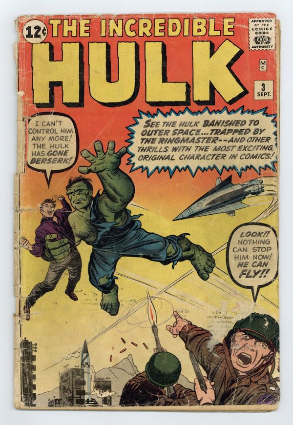 Cover pencils by Jack Kirby, inks by Dick Ayers. First Silver Age appearance of the Ringmaster and the Circus of Crime in "Banished to Outer Space!;" The military captures Rick and Ross convinces him that they need the Hulk to test a new experimental rocket for national security; Rick tricks the jade giant into the capsule but once it is shot into space, he realizes that Ross deceived him to get rid of his foe. "The Origin of the Hulk!," script by Stan Lee, pencils by Jack Kirby, inks by Dick Ayers. The Ringmaster, script by Stan Lee, pencils by Jack Kirby, inks by Dick Ayers; Rick takes a break from his Hulk-sitting duties and goes to the circus. 36 pgs., full color. $0.12. Cover price $0.12.