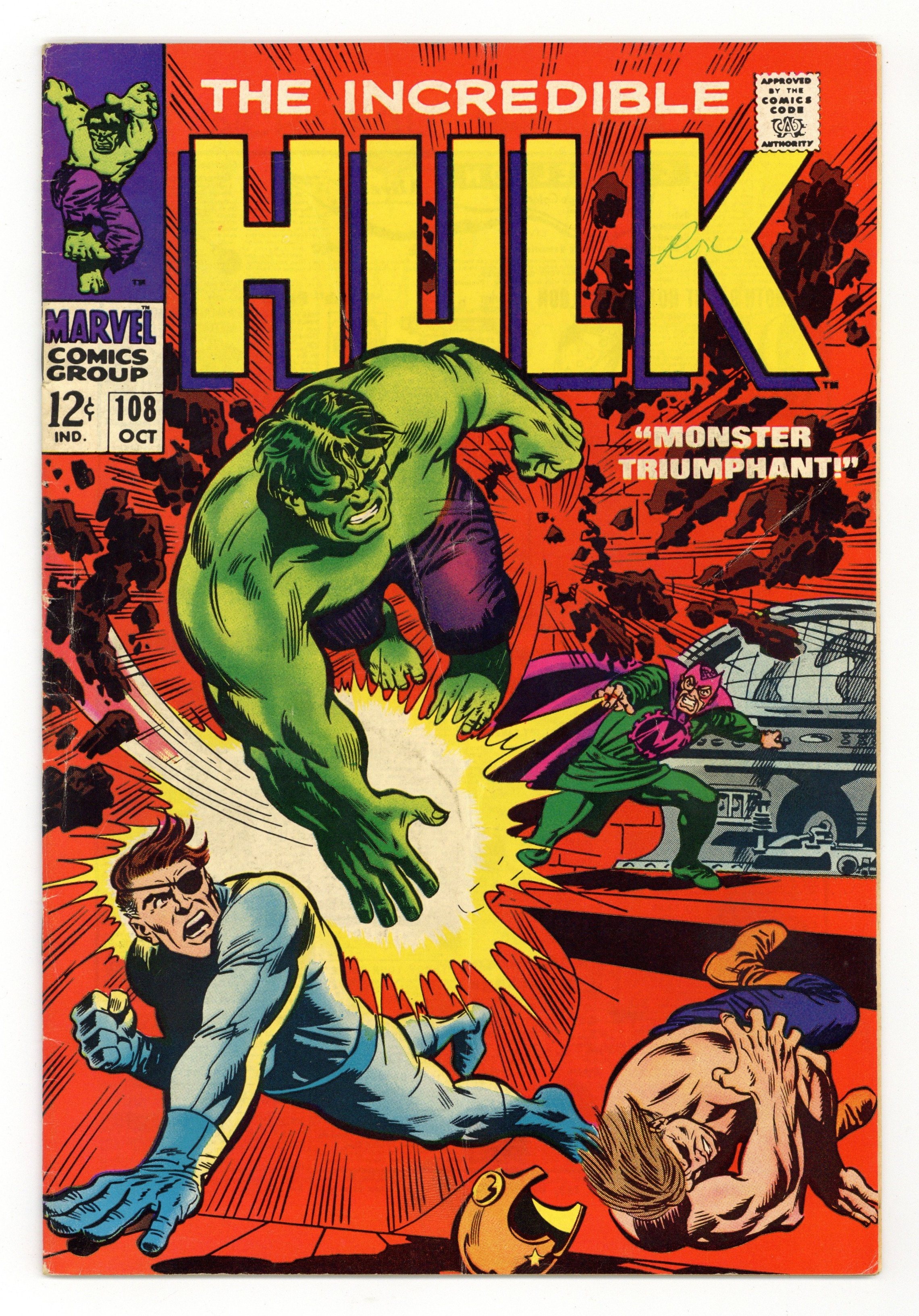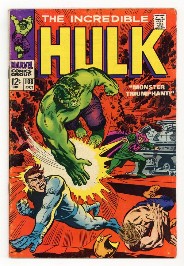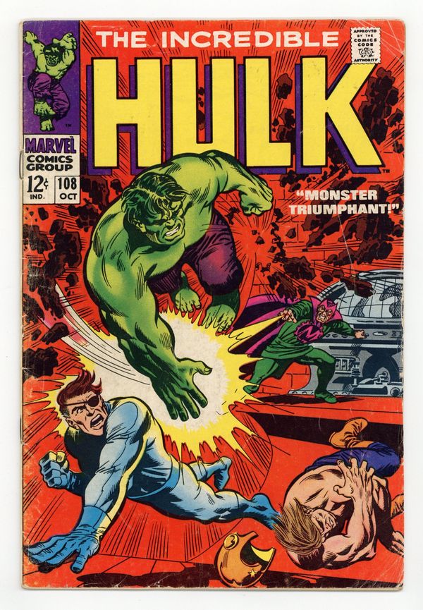 Tags: Marvel Legacy Numbering: Hulk (part 108), Hulk$33.50Cover pencils by Marie Severin, inks by Frank Giacoia. Monster Triumphant!, script by Stan Lee, pencils by Herb Trimpe, inks by John Severin; The Mandarin controls the Hulk and sends him to attack a Red Chinese target; Fury and his old foe Brevlov team up to take on the jade giant; Once the Hulk breaks Mandarin's conditioning, he returns and destroys the ringed one's base of operations. 36 pgs. $0.12. Cover price $0.12.