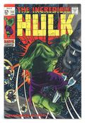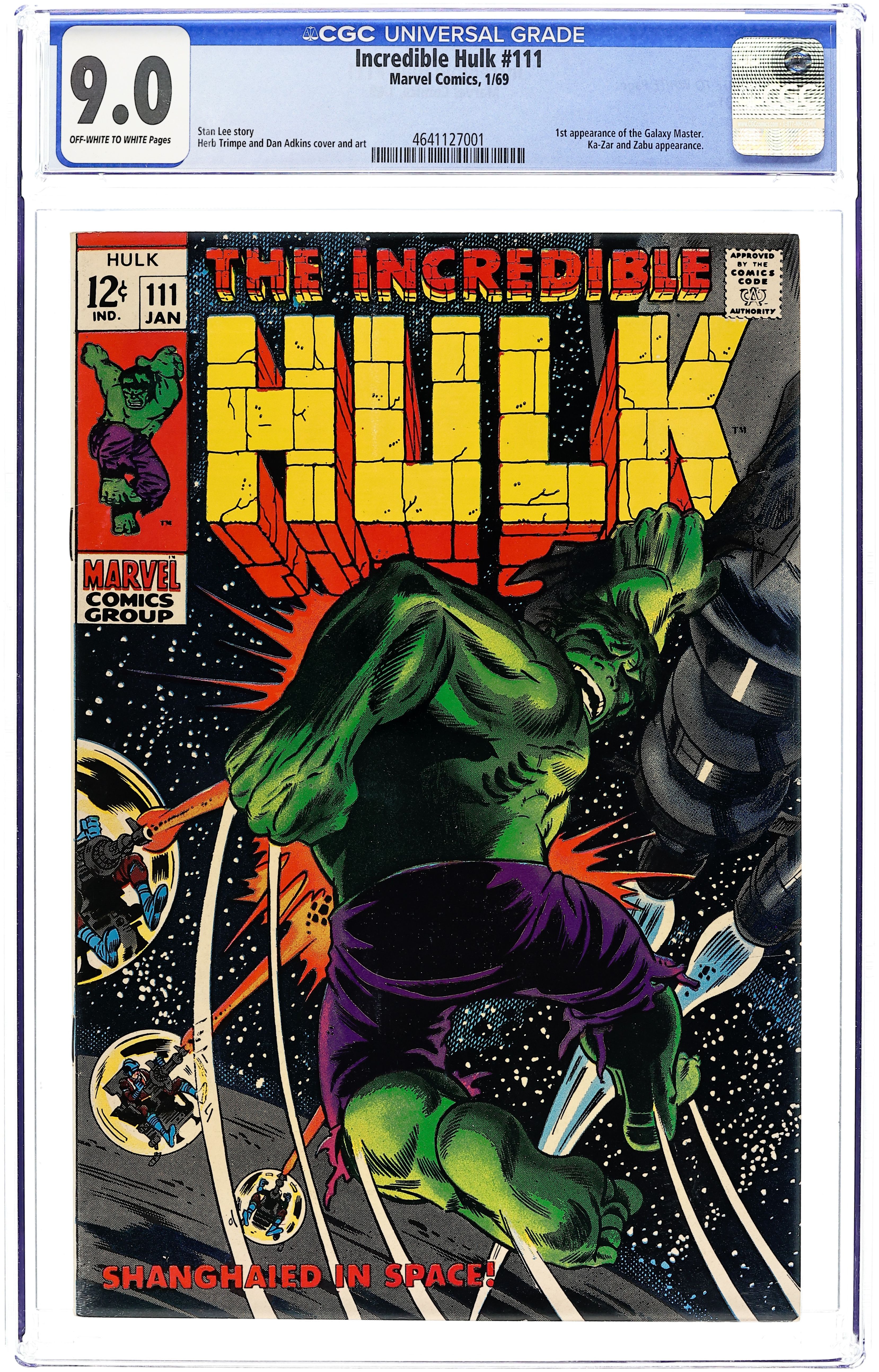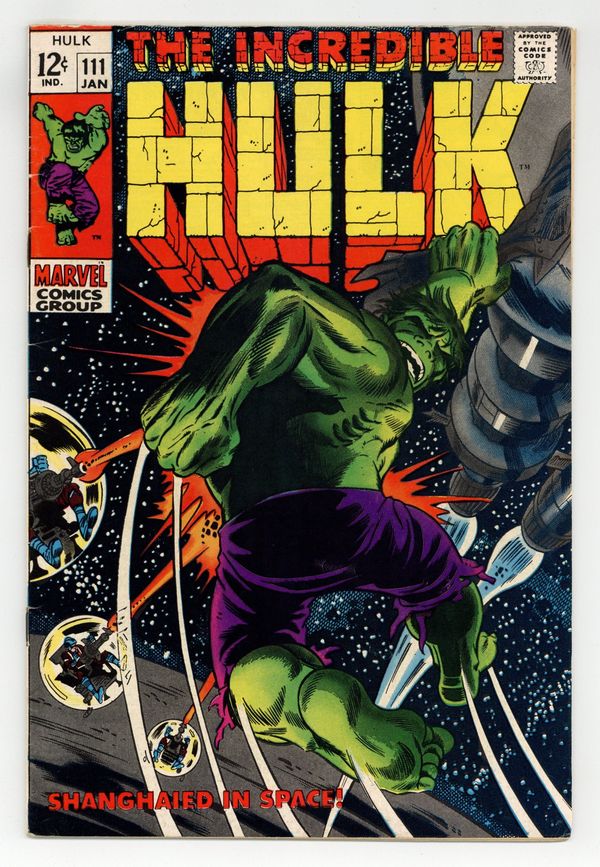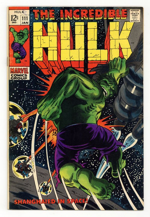 Tags: Marvel Legacy Numbering: Hulk (part 111), Hulk$43.00Cover pencils by Herb Trimpe, inks by Dan Adkins. Shanghaied In Space!, script by Stan Lee, pencils by Herb Trimpe, inks by Dan Adkins; The aliens who sent Umbu to destroy the earth capture Bruce Banner after the Hulk defeats their killer robot; Bringing him back to life (Bruce died at the end of last issue), the aliens find they have their hands full as they wage a pitched space battle with Bruce's alter ego, the incredible Hulk; Making it to their home planet, Hulk finds himself faced with the awesome might of the Galaxy Master. 36 pgs. Cover price $0.12.