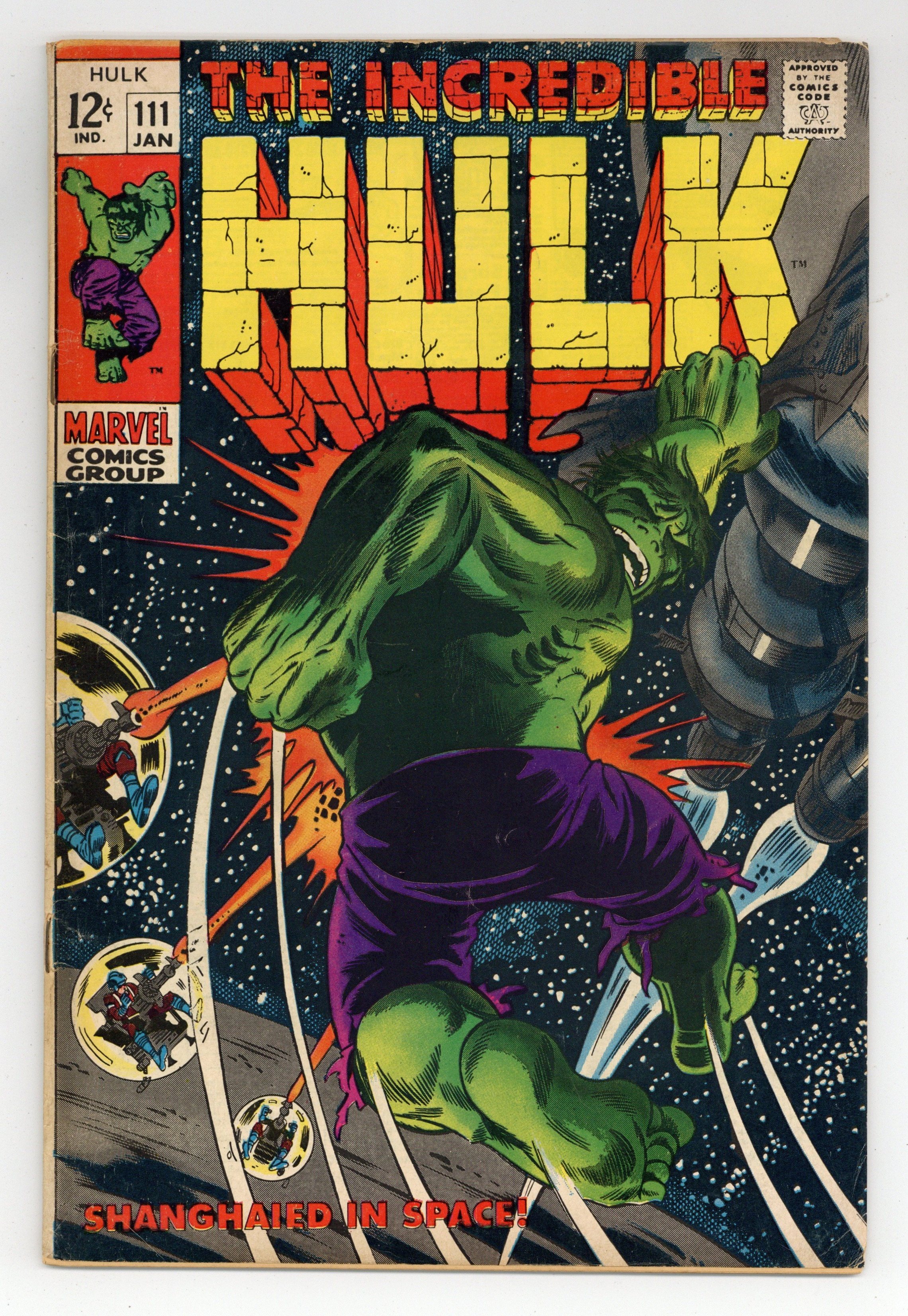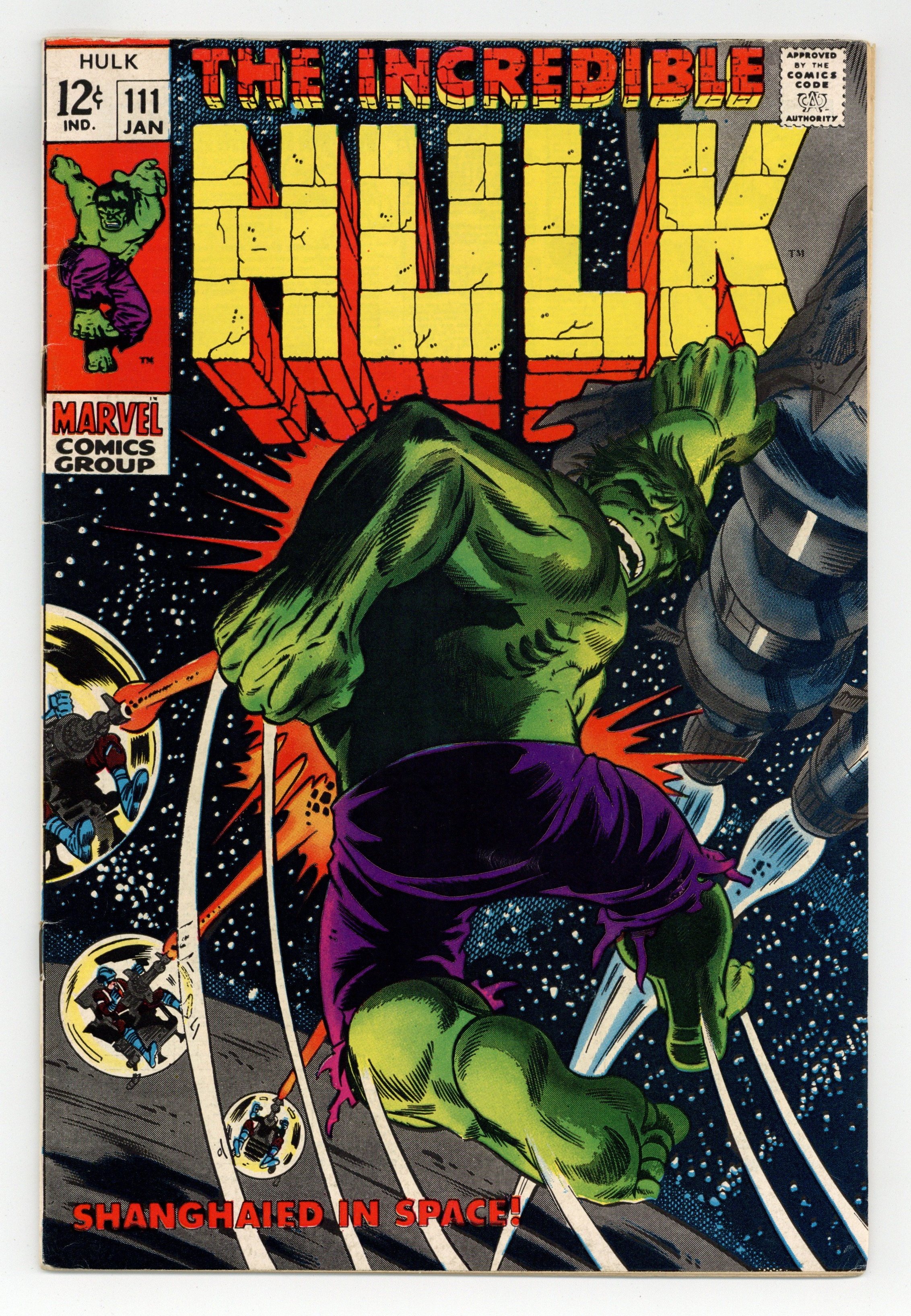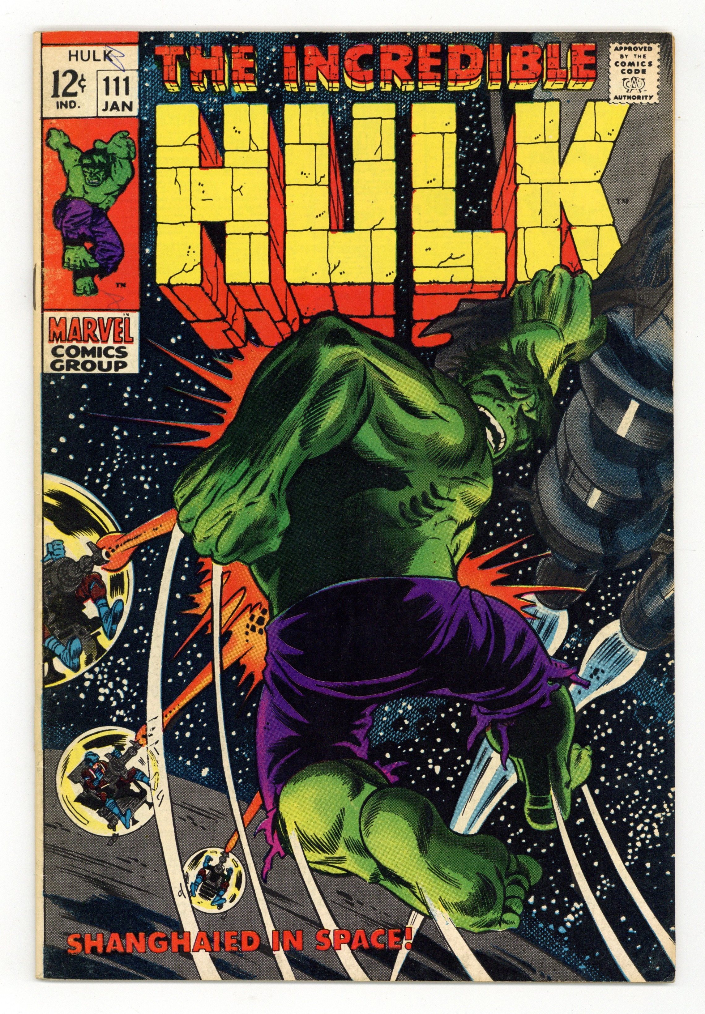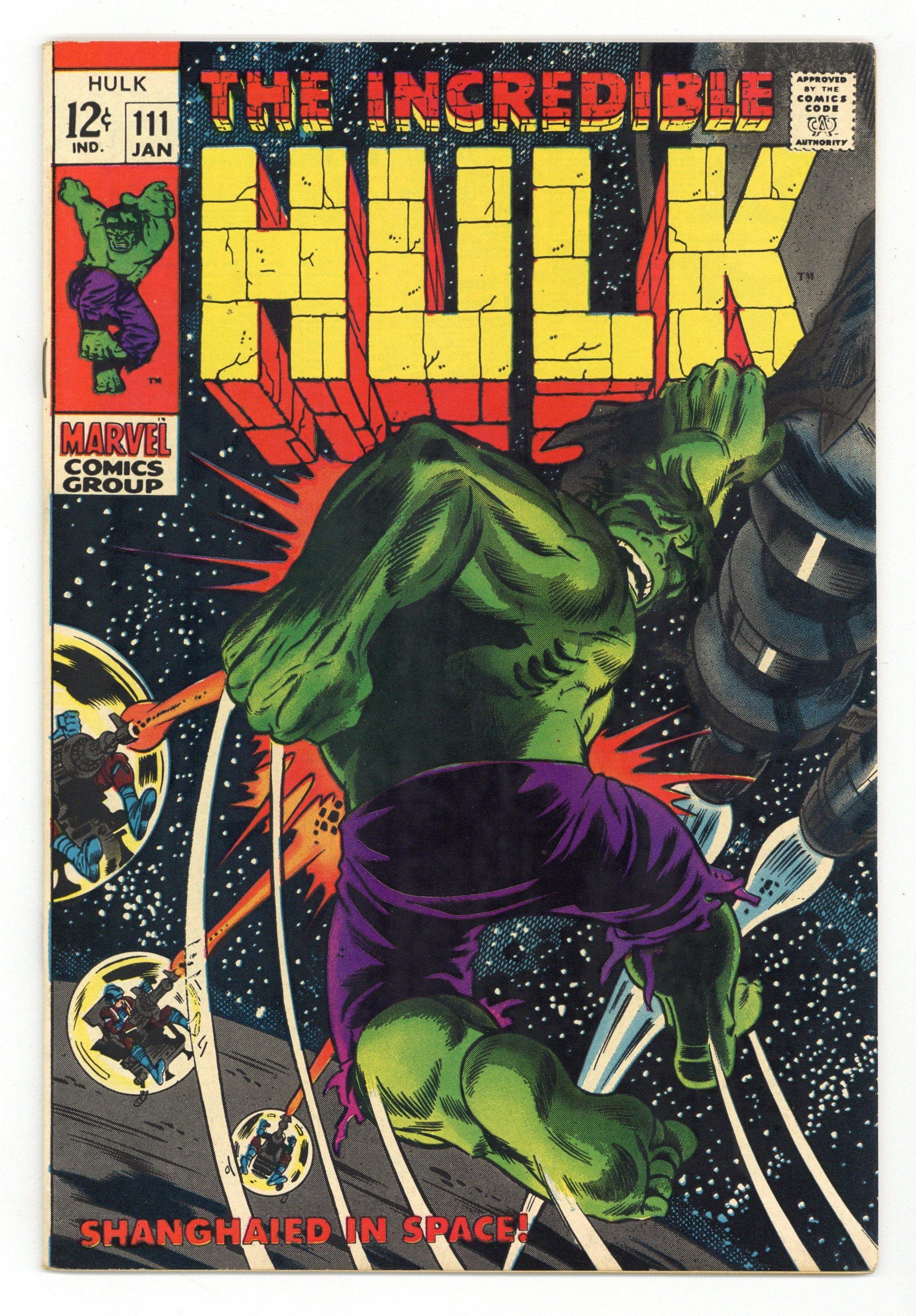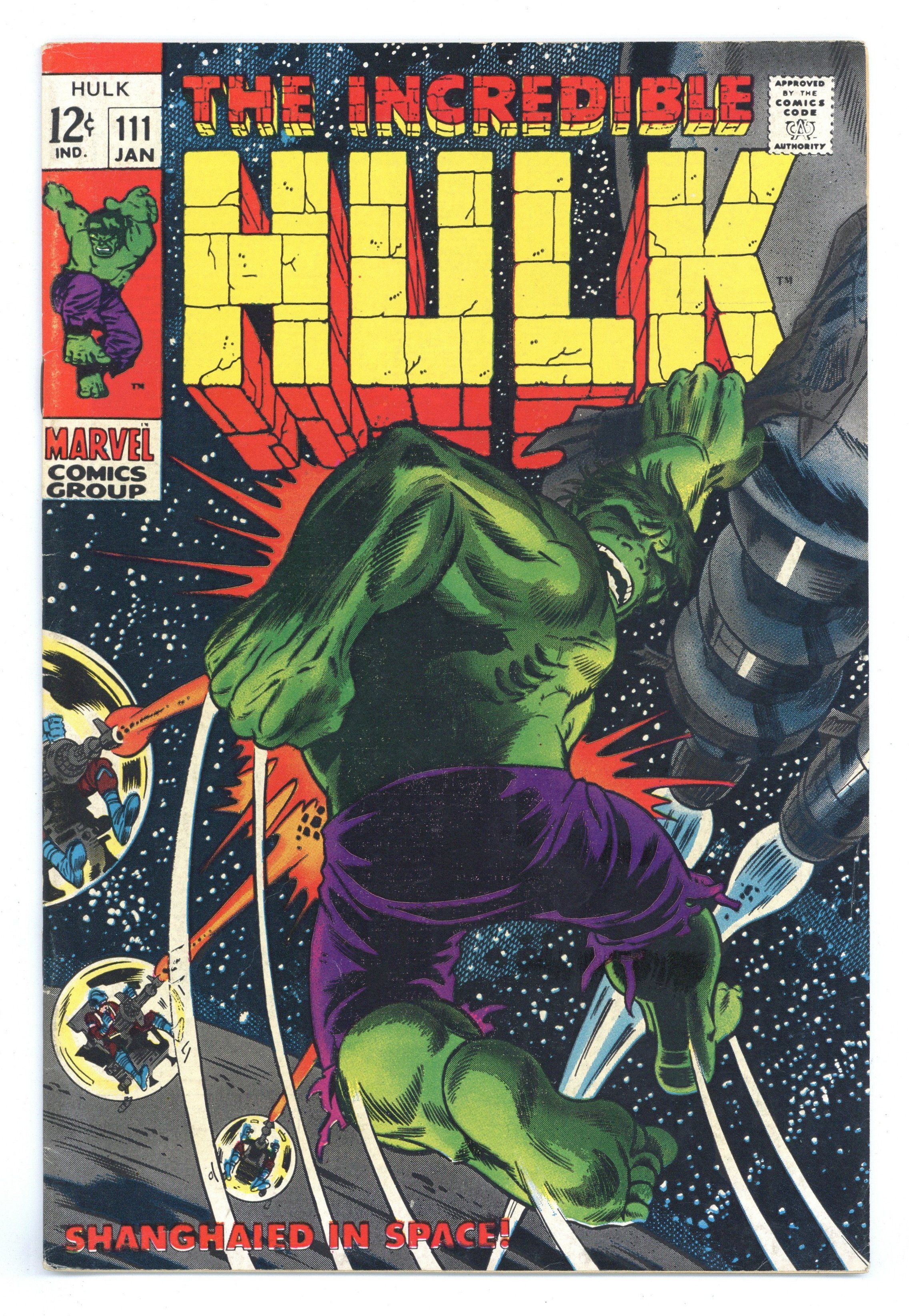 Cover pencils by Herb Trimpe, inks by Dan Adkins. Shanghaied In Space!, script by Stan Lee, pencils by Herb Trimpe, inks by Dan Adkins; The aliens who sent Umbu to destroy the earth capture Bruce Banner after the Hulk defeats their killer robot; Bringing him back to life (Bruce died at the end of last issue), the aliens find they have their hands full as they wage a pitched space battle with Bruce's alter ego, the incredible Hulk; Making it to their home planet, Hulk finds himself faced with the awesome might of the Galaxy Master. 36 pgs. Cover price $0.12.