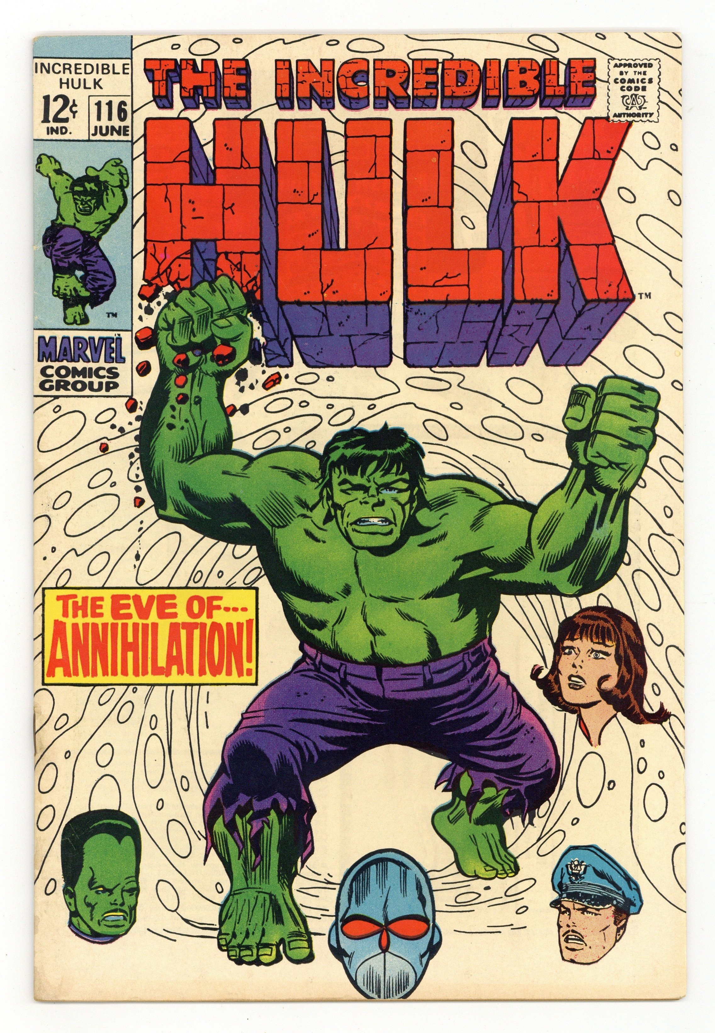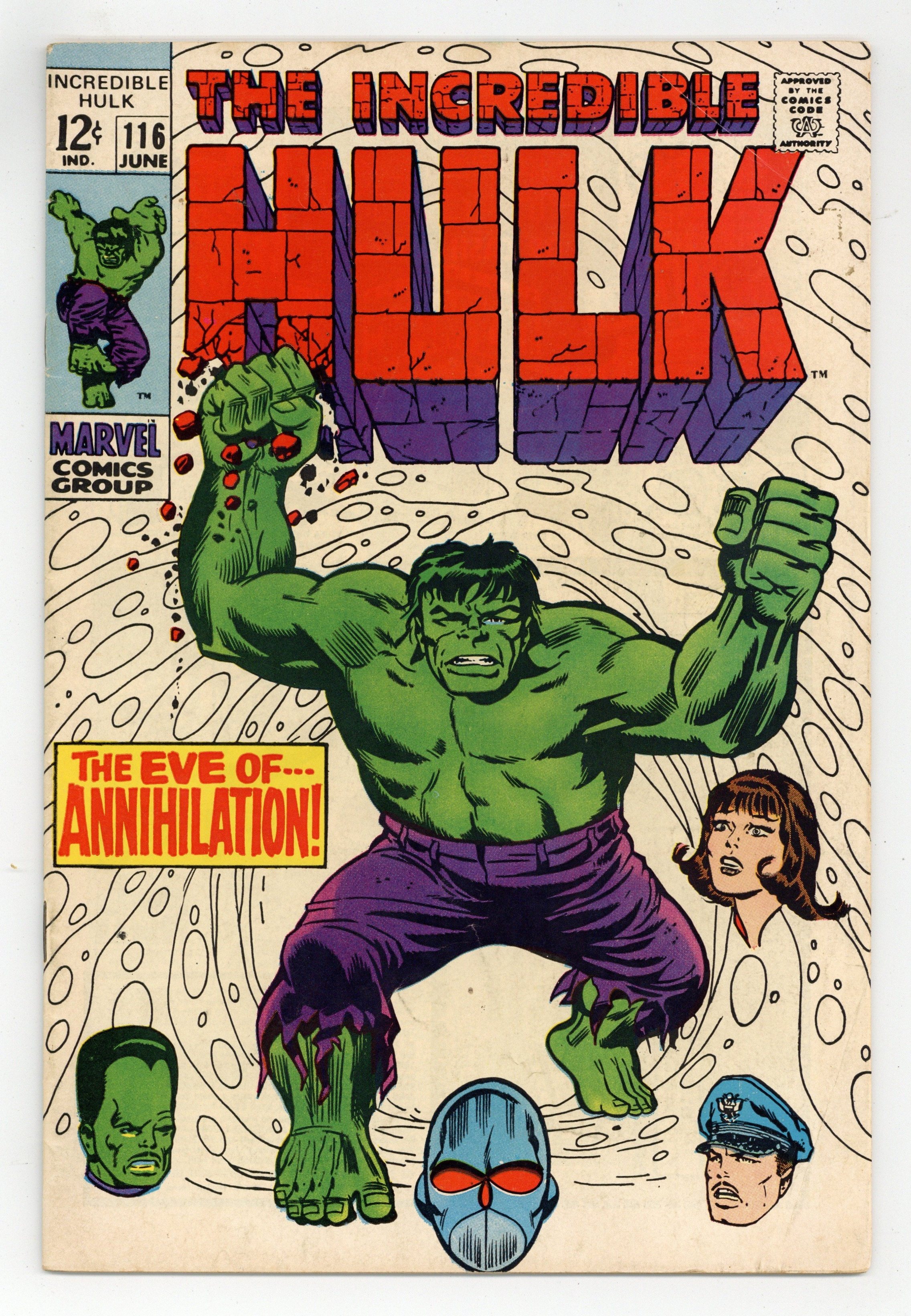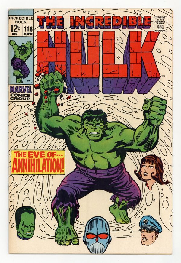 Cover art by Herb Trimpe. The Eve of Annihilation, script by Stan Lee, pencils by Herb Trimpe, inks by Dan Adkins; With the Hulk in an unbreakable plastic prison of the Leader's design, things start to look a little fishy as the Leader moves his Giant Humanoid onto the missile base and begins to take over; Betty hears the Leader soliloquizing to himself about his plans for world domination and she convinces Talbot to try and free the Hulk; Once he escapes, the Hulk has to battle through the Super Humanoid to try and stop the Leader from starting a nuclear war. 36 pgs. $0.12. Cover price $0.12.