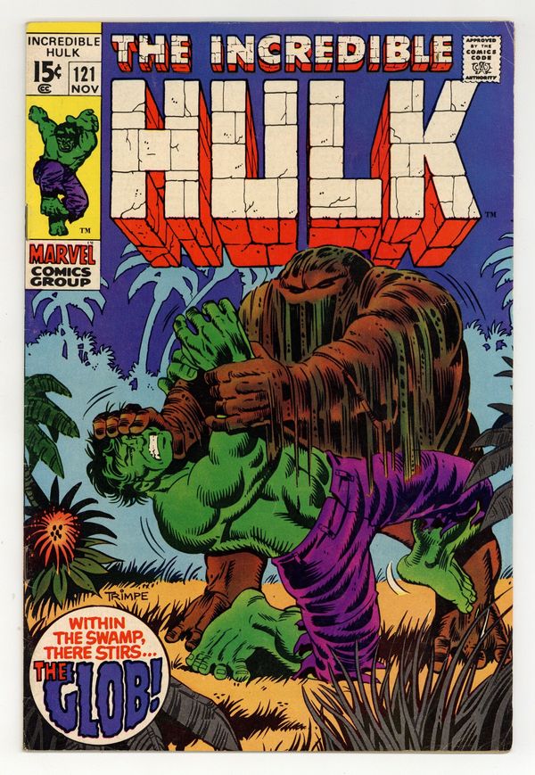 Tags: Marvel Legacy Numbering: Hulk (part 121), Hulk$19.00Cover art by Herb Trimpe. Within the Swamp There Stirs...a Glob!, script by Roy Thomas, art by Herb Trimpe; Hulk is leaping over Florida when he is accidentally struck by a missile causing him to crash land in the swamp; Coming across an old U.S. government cabin, Hulk destroys some barrels of radioactive waste which creates a muck monster soon to be known as the Glob; The army is in the marsh hunting the Hulk when the Glob captures Betty, thinking she is the woman he loved back in the days when he was a human; The Hulk and the Glob battle but the muck monster ends up giving his life in helping the Hulk save Betty from anti-radioactive goop that Ross has poured into the swamp in order to kill both the Glob and the Hulk. 36 pgs. $0.15. Cover price $0.15.