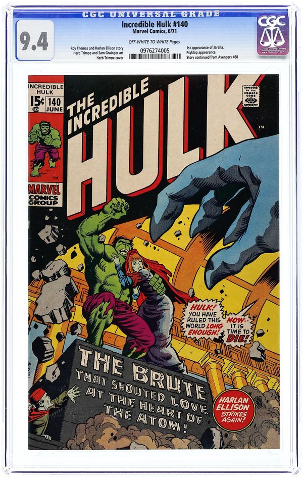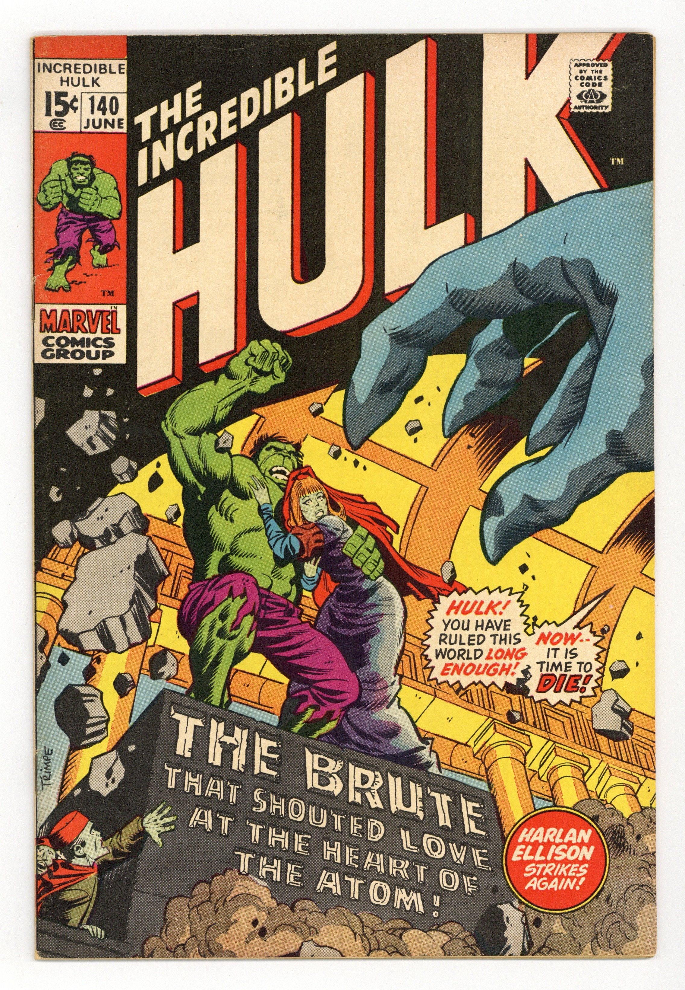 1st Printing. Cover art by Herb Trimpe. Story continued from Avengers (1963-1996 1st Series) #88. The Brute That Shouted Love at the Heart of the Atom, script by Harlan Ellison (plot) and Roy Thomas (script), pencils by Herb Trimpe, inks by Sam Grainger; Hulk is shrunk down to infinitesimal size and enters Jarella's world where he regains Bruce Banner's mind, becomes a hero and is betrothed to the queen; that is, until Psyklop shows up to ruin things; guest appearances by Captain America, Thor, Iron Man, Goliath, and the Falcon. Continued from The Avengers #88. Inspired by a 1922 Ray Cummings story. Billy Batson and "Shazam" mentioned. 36 pgs. $0.15. NOTE: 1994 JC Penney reprint exists. Can be identified by having a Stridex ad on the back cover. Cover price $0.15.