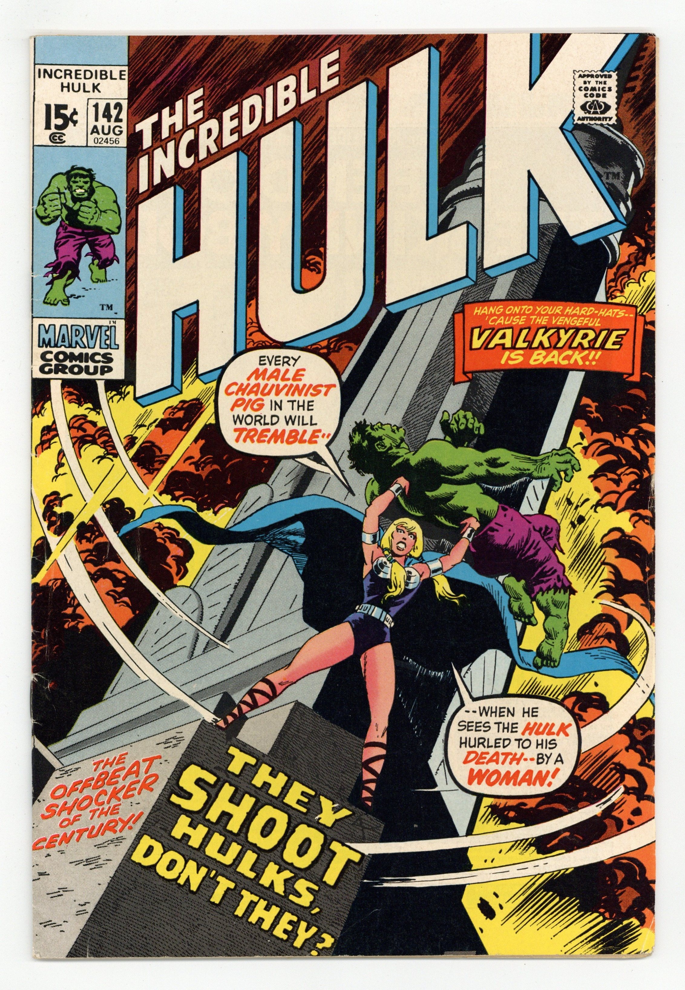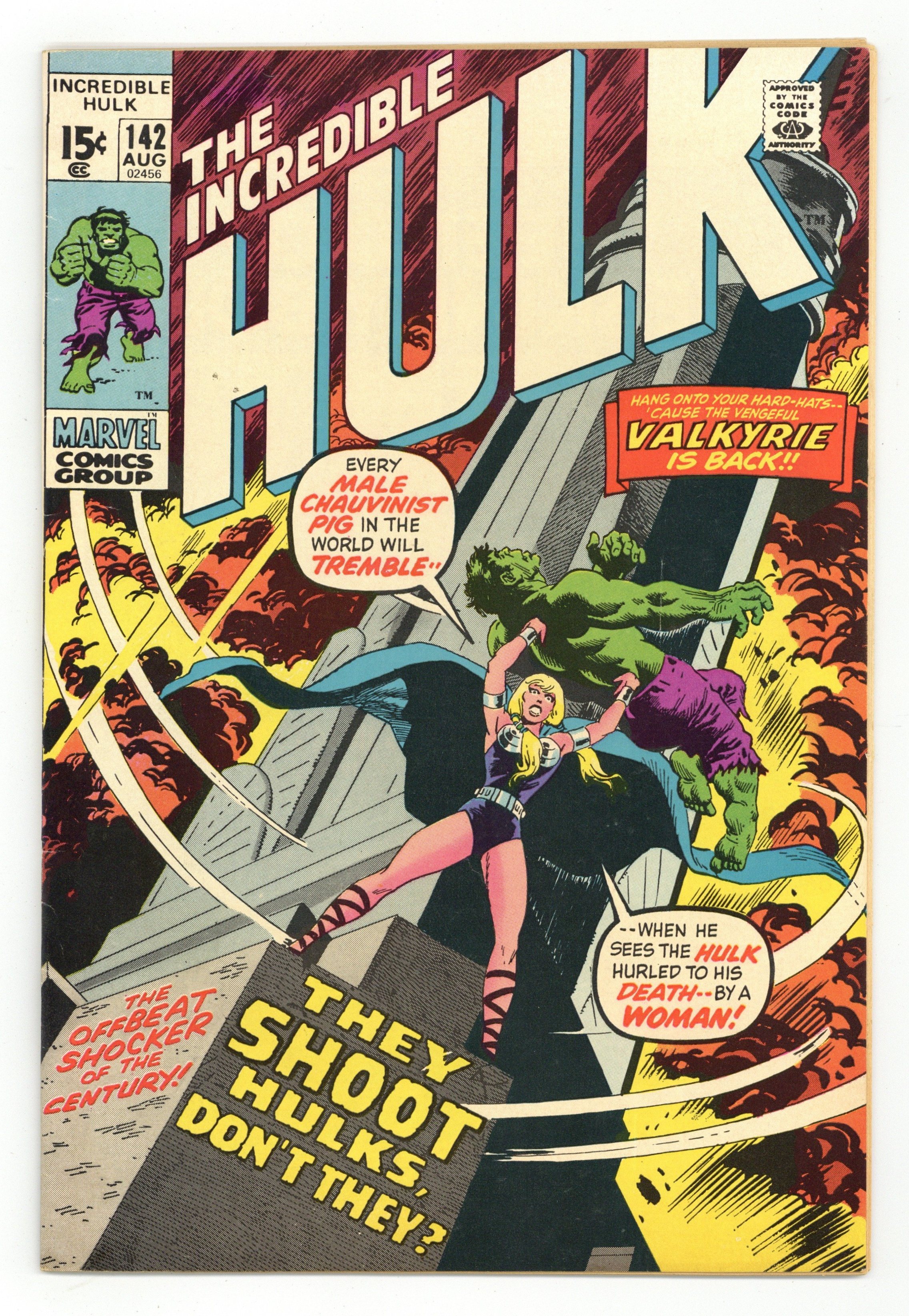 Cover pencils by Herb Trimpe, inks by John Severin. They Shoot Hulks, Don't They?, script by Roy Thomas, pencils by Herb Trimpe, inks by John Severin; The Hulk is the focus of a social event as the Parringtons bring him to a party but their women's lib daughter is given the powers of the Valkyrie by the Enchantress and battles the jade giant. House ad for Conan the Barbarian #8, pencils by Barry Smith. Cameo by author Tom Wolfe. (This story is inspired in part by Wolfe's novel "Radical Chic.") 36 pgs. $0.15. Cover price $0.15.