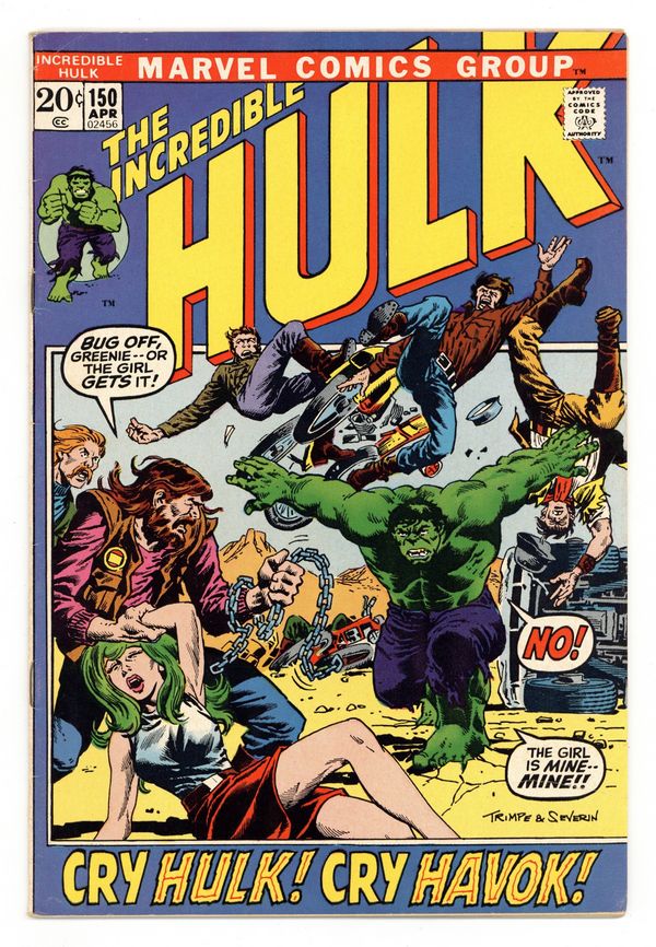 Cover pencils by Herb Trimpe, inks by John Severin. Cry Hulk, Cry Havok!, script by Archie Goodwin, pencils by Herb Trimpe, inks by John Severin; Hulk escapes Project Greenskin and begins to hunt for Jarella; When he accidentally mistakes Lorna Dane and her green hair for his lost love, this puts him into conflict with her very powerful boyfriend, Havok, who handily beats him; Betty and Glenn find Bruce lying unconscious in the desert and, in a state of delirium, Bruce professes his love for Jarella to the woman he is supposed to be in love with; Iceman (of the X-Men) cameo. 36 pgs. $0.20. Cover price $0.20.