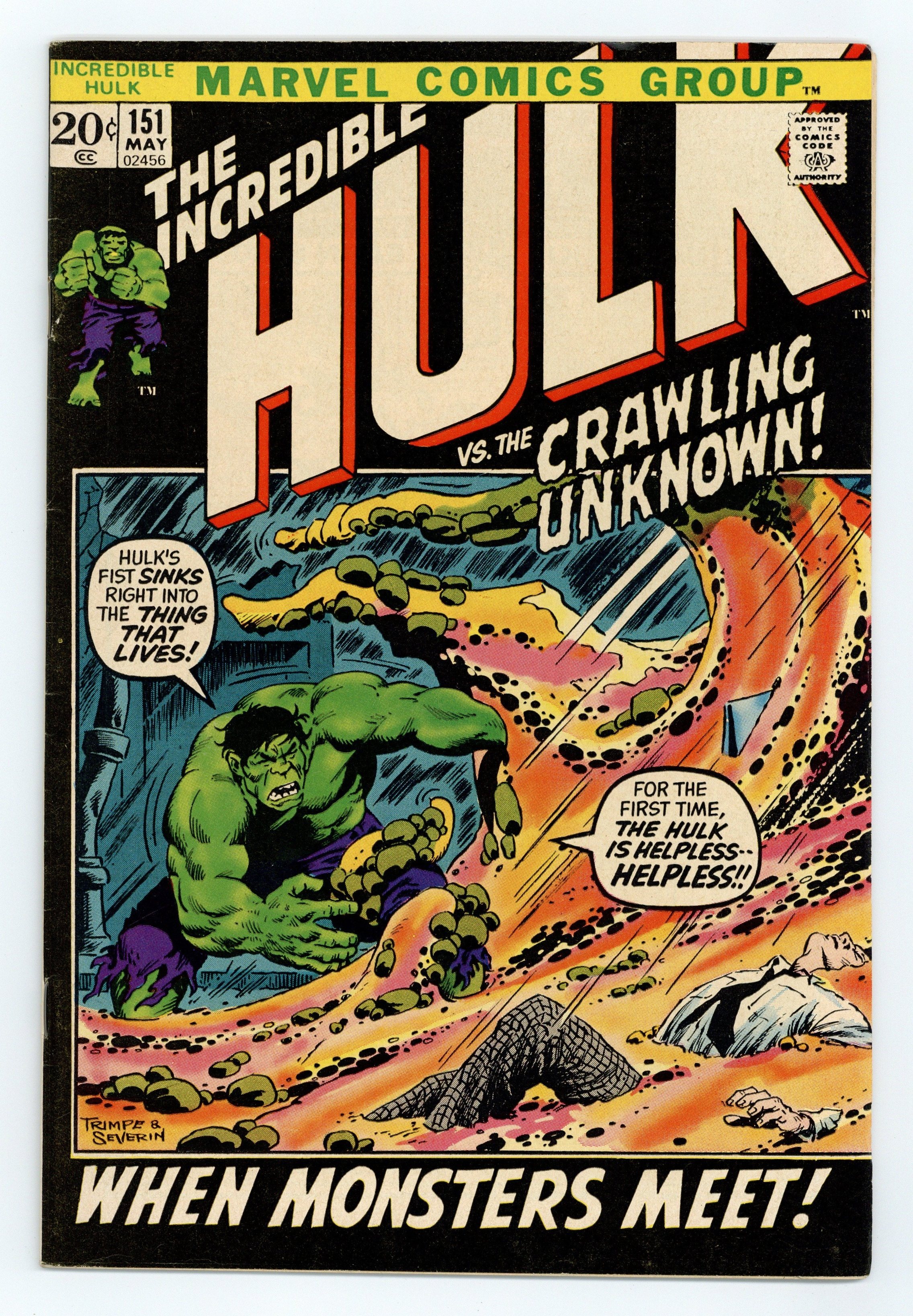 Tags: Marvel Legacy Numbering: Hulk (part 151), Hulk$32.50Cover pencils by Herb Trimpe, inks by John Severin. When Monsters Meet!, script by Archie Goodwin, pencils by Herb Trimpe, inks by John Severin; Bruce heads to Washington D.C. to try and enlist Hank Pym's help in shrinking him small enough to reach Jarella's subatomic world; Enraged when he can't track down Ant-Man, Bruce turns into the Hulk and has to fend off a toxic glob that used to be a U.S. senator who was using Hulk's gamma irradiated blood to try and cure his cancer (which obviously turned out to be a bad idea). Statement of Ownership average # of copies in preceding 12 months: 367,427. 36 pgs. $0.20. Cover price $0.20.