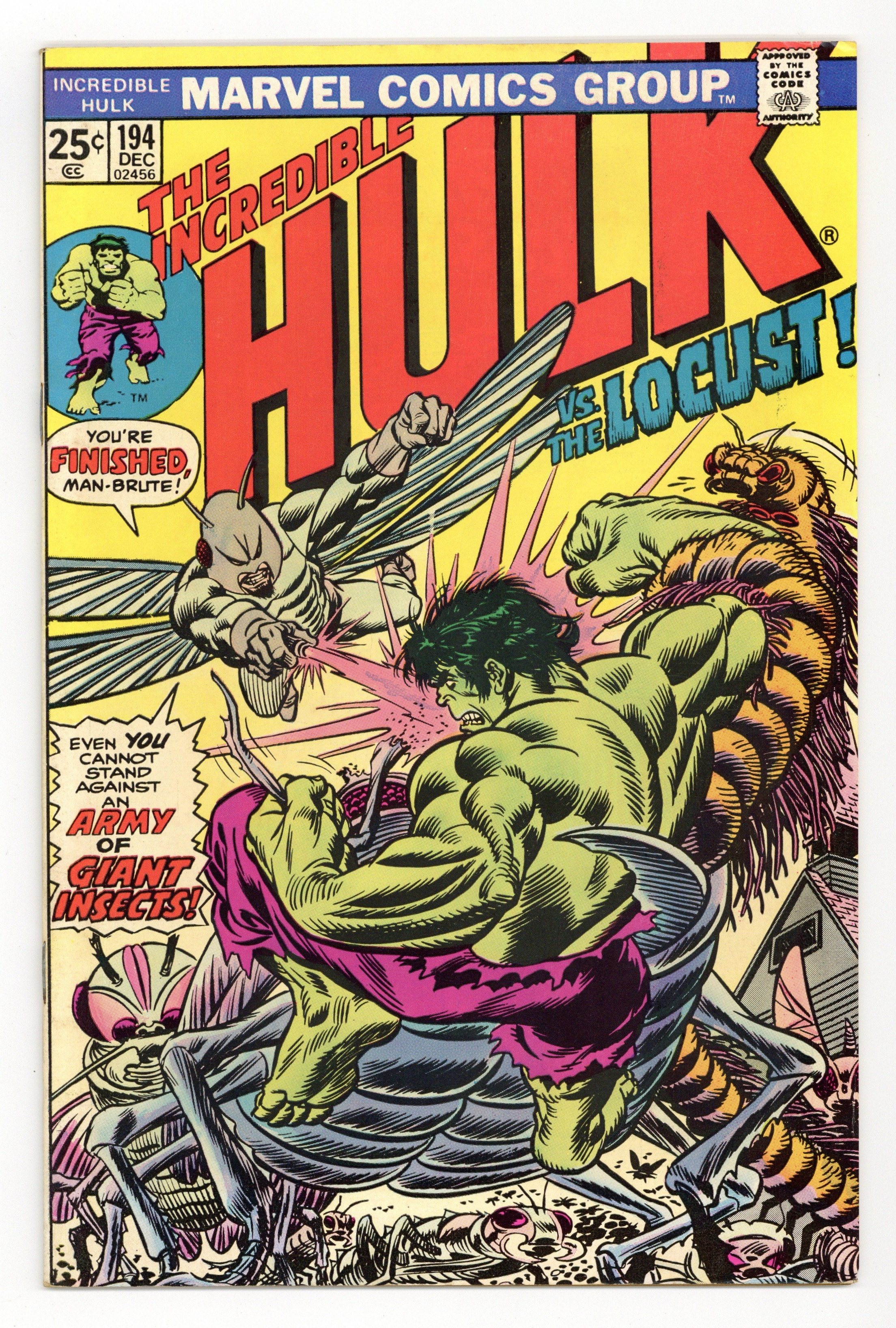 Tags: Marvel Legacy Numbering: Hulk (part 194), Hulk$5.30Cover pencils by Gil Kane, inks by John Romita. The Day of the Locust! starring The Hulk, Doc Samson, Thunderbolt Ross, Clay Quartermain, Betty Ross, Locust, and Abomination, script by Len Wein, pencils by Sal Buscema (breakdowns) and Joe Staton (finished art), inks by Joe Staton; Hulk helps a girl and her boyfriend flee from her super villain father. Story continues from Iron Man Annual 3. 36 pgs. Cover price $0.25.