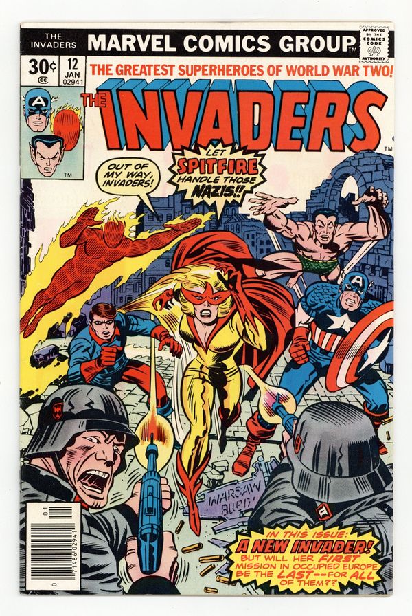Part 1 of 2 - "To the Warsaw Ghetto!" Written by Roy Thomas. Art by Frank Robbins and Frank Springer. The Invaders welcome a new hero to their ranks. But will Spitfire's first mission in occupied Europe be the Invaders' last? 1st appearance of Jacqueline Falsworth as Spitfire (see Invaders #7 for her 1st civilian app.). 32 pages FC Cover price $0.30.