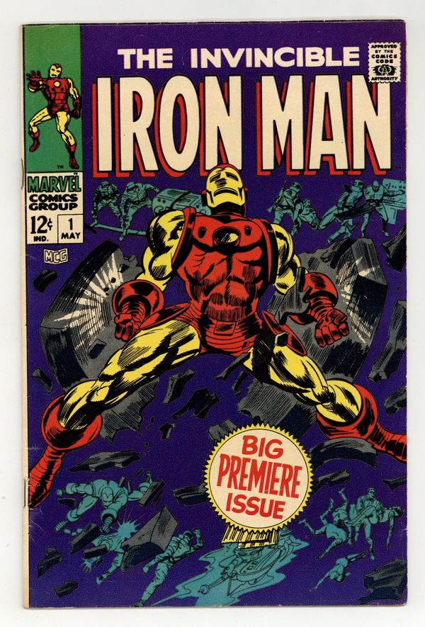 Cover pencils by Gene Colan, inks by Mike Esposito. "Alone Against AIM," script by Archie Goodwin, pencils by Gene Colan, inks by Johnny Craig; Iron Man is captured by A.I.M using a suction beam and trapped in a submarine by orders of Mordius; Meanwhile A.I.M. soldiers are gloating about how they have sunk The Maggias gambling ship and destroyed their leadership; The Golden Avenger is knocked out by gas while back on the sinking Maggia ship Jasper Sitwell is evacuating the passengers; Sitwell stumbles upon Whitney Frost whom he recognises from Stark Industries as one of Tonys admirers; Sitwell rescues Frost and they are taken aboard a S.H.I.E.L.D. helicopter where Nick Fury awaits; When alone Frost reveals herself to be The Big M, leader of The Maggia, and her plan to use Sitwell to learn the secrets of Stark Industries. Continued between Iron Man and Sub-Mariner #1 and Avengers #51. "The Origin of Iron Man," script by Archie Goodwin, pencils by Gene Colan, inks by Johnny Craig; An abridged retelling of Iron Man's origin from Tales of Suspense #39. 36 pgs., full color. $0.12. Cover price $0.12.