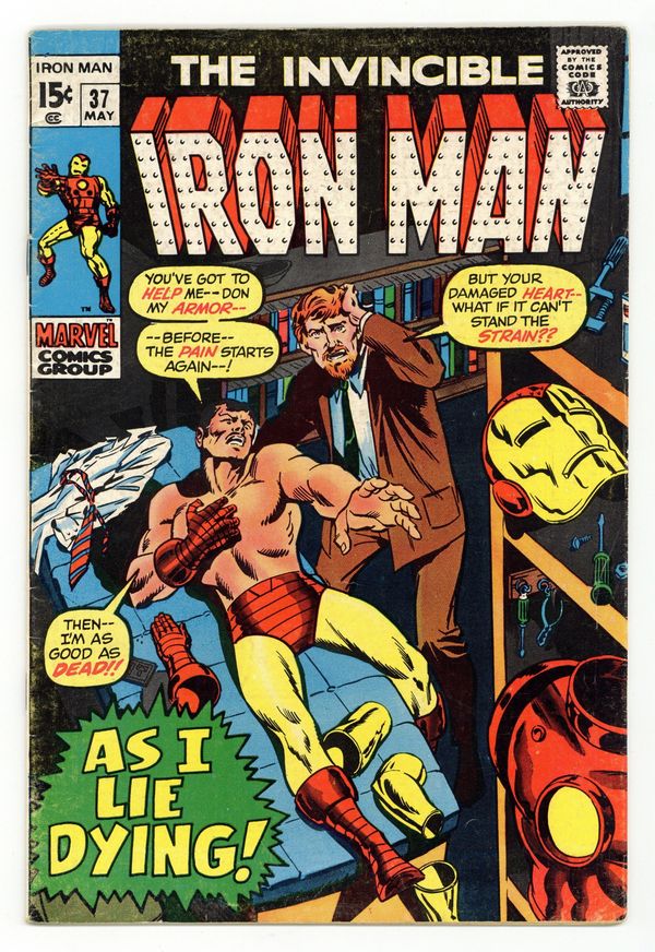 Tags: Marvel Legacy Numbering: Iron Man (part 37), Iron Man$10.50"In This Hour of Earthdoom!" Story by Gerry Conway. Art by Don Heck and Jim Mooney. Cover by Marie Severin and Sal Buscema. Iron Man lies seriously wounded after his battle against Ramrod. Tony's transplanted heart is failing, and only Kevin O'Brien can save him! Meanwhile, Ramrod and his master, the Foreman, are still planning to destroy the Earth. The Foreman has also captured Marianne. It may take a miracle for Shell-head to emerge victorious on this day. 32 pages Cover price $0.15.