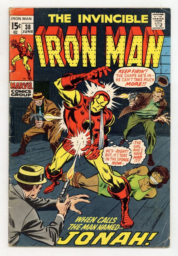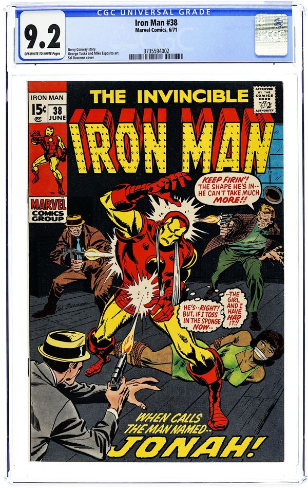 Tags: Marvel Legacy Numbering: Iron Man (part 38), Iron Man$6.40"When Calls Jonah!" Story by Gerry Conway. Art by George Tuska and Mike Esposito. Cover by Sal Buscema. Tony Stark hires a new employee with a criminal past, but it's possible the new employee, Frankie Majors, may have been framed. Iron Man investigates the situation and quickly runs afoul of Jonah! 32 pages Cover price $0.15.