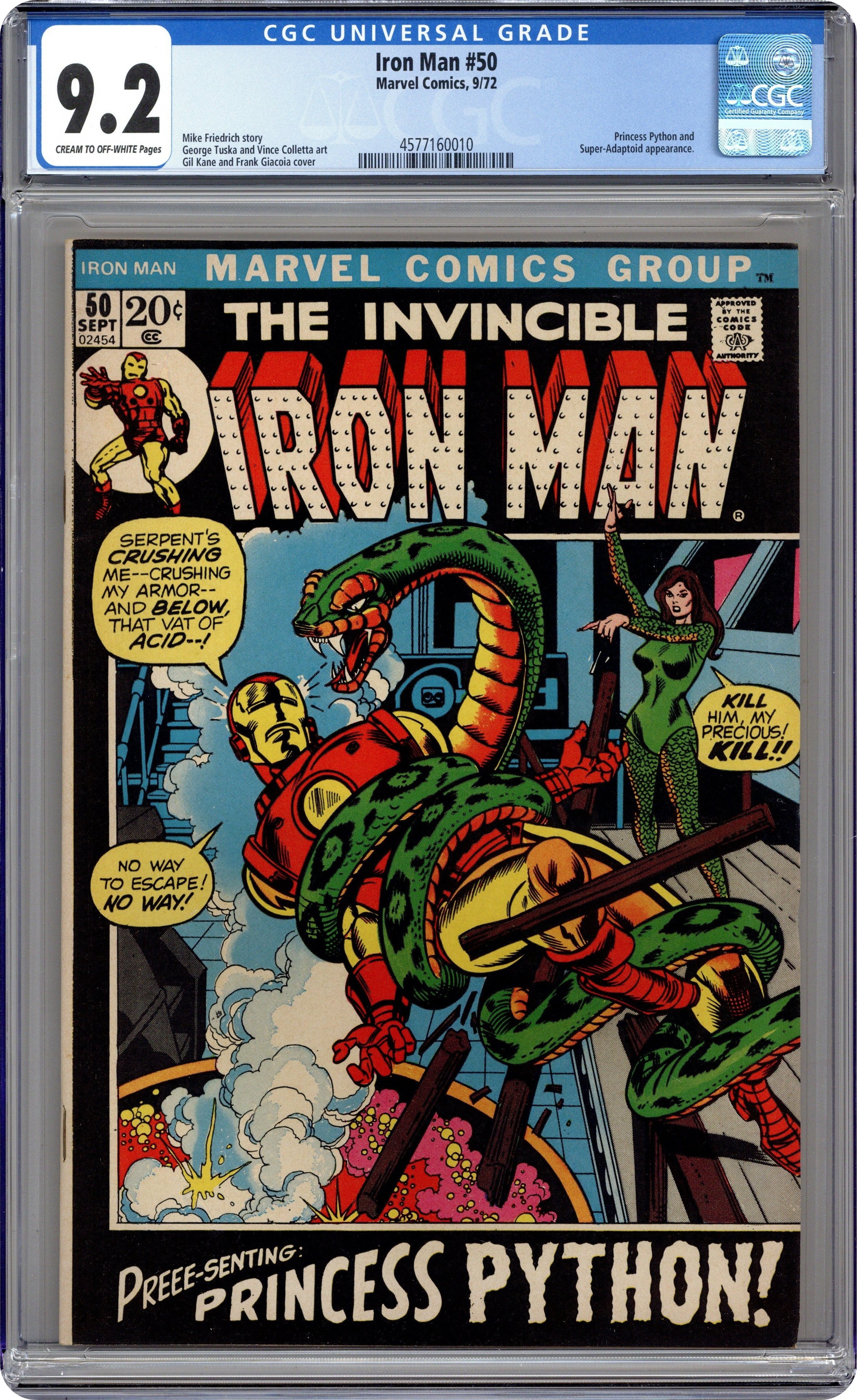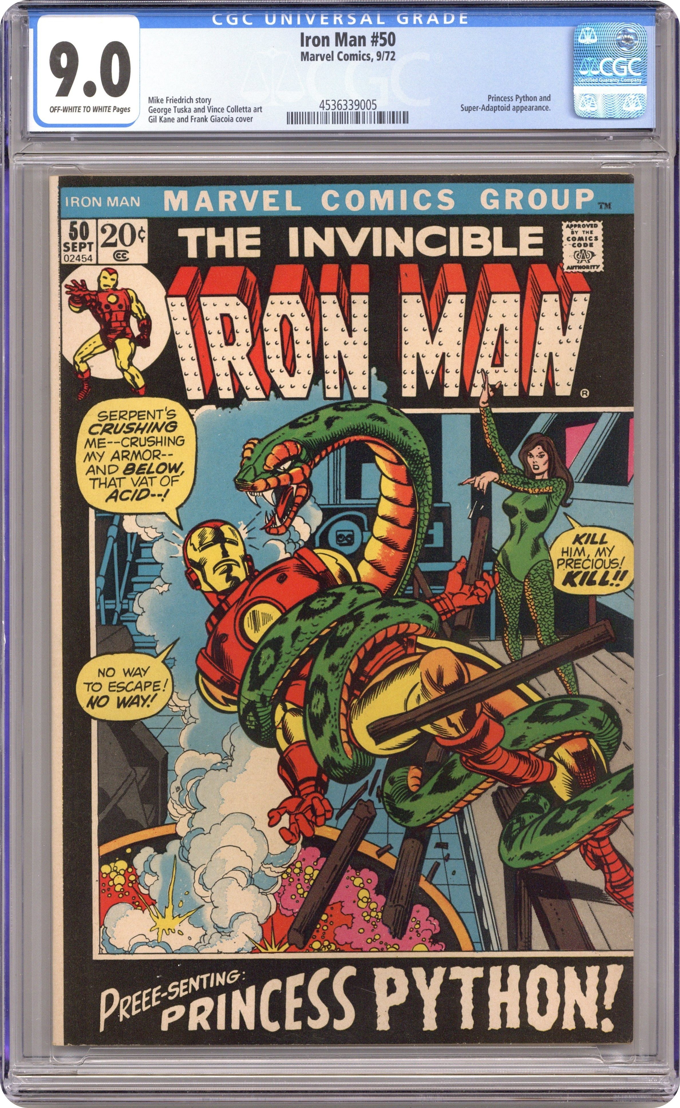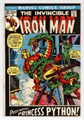 "Deathplay!" Story by Mike Friedrich. Art by George Tuska and Vince Colletta. Cover by Gil Kane. During a news media interview, Tony Stark is seized by Princess Python's pet snake! Tony breaks free and now Princess Python must face Iron Man! Shell-head and the pet python engage in a death duel over a vat of acid! Which one is going to take the fatal plunge? Meanwhile, Marianne is continuing to have terrifying visions of a being called the Cyborg-Sinister. 32 pages Cover price $0.20.