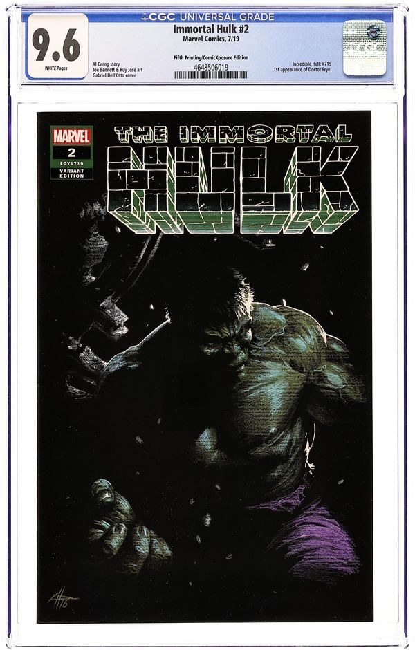 ComicXposure exclusive variant by Gabriele Dell'Otto. Written by Al Ewing. Art by Joe Bennett. A random small-town tragedy. A mystery illness that spreads with grief. A green glow on a lonely mountain. Three puzzle pieces that fit together to make a nightmare. And the only mind on Earth than can connect them upā¦belongs to the Immortal Hulk. 28 pages, full color. Rated T+