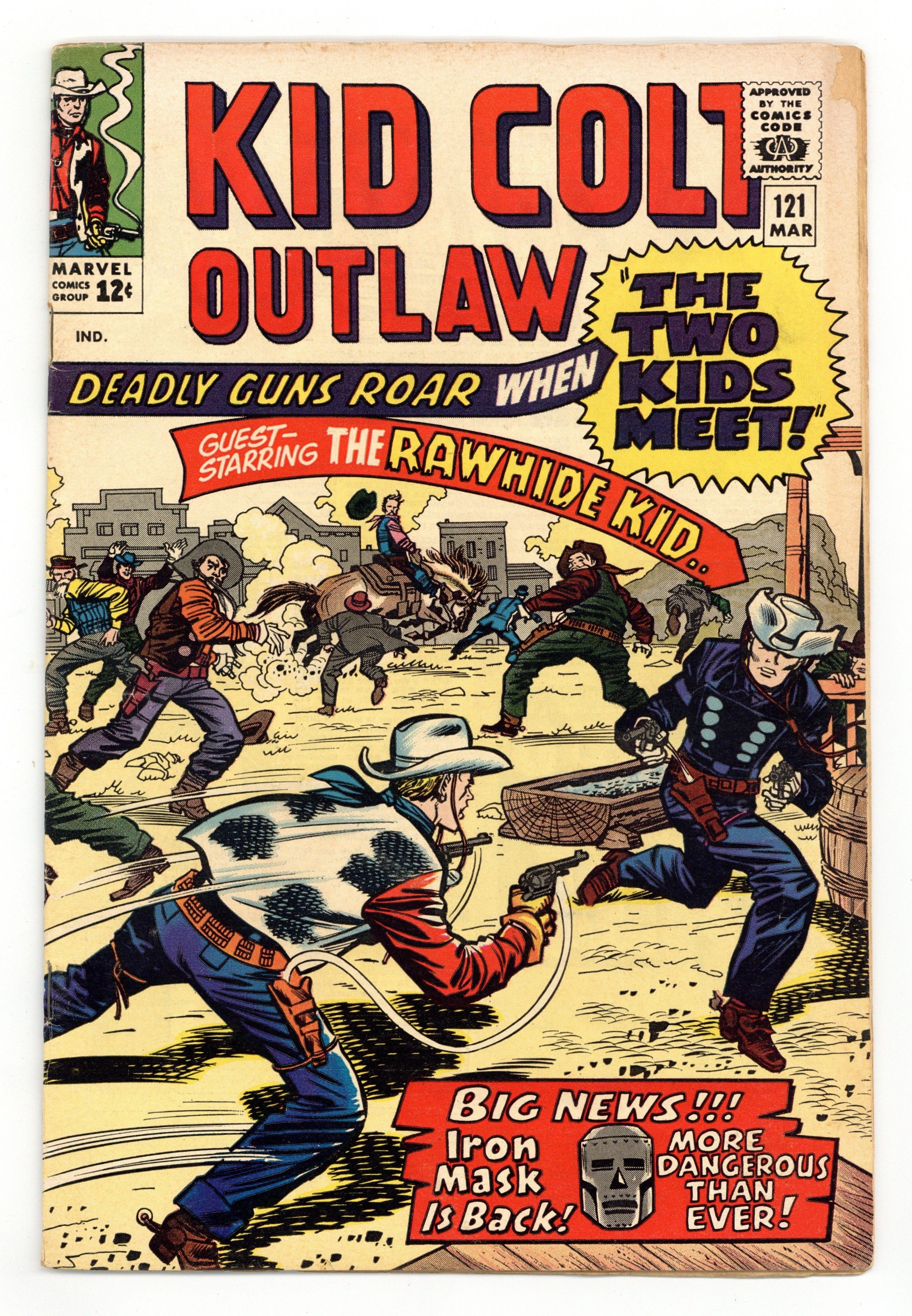 Cover pencils by Jack Kirby, inks by Chic Stone. Iron Mask Strikes Again!, script by Stan Lee, art by Jack Keller; Marshal Sam Hawk captures both Kid Colt and the Rawhide Kid; The two outlaws escape from jail and help Sam capture Iron Mask. House ad for Two Gun Kid #74, pencils by Jack Kirby, inks by Chic Stone. Hogan's Hiding Place, script and art by Larry Lieber; Bart Hogan shoots Judge Farnsworth while committing a robbery; He joins the Calvary to hide from the posse. 36 pgs. $0.12. Cover price $0.12.