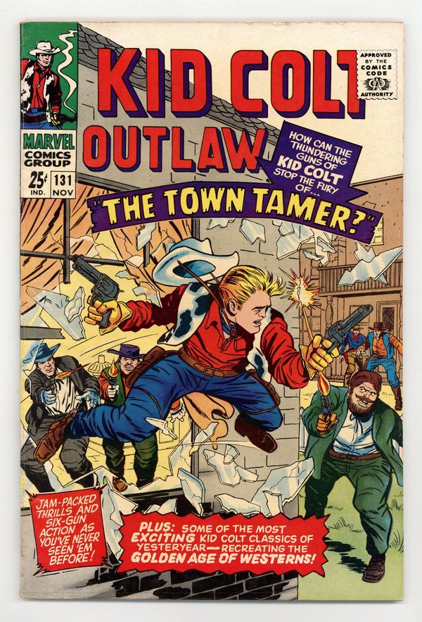 68-page giant. New story: "The Town Tamer" (script by Larry Lieber, art by Jack Keller). Reprints: "The Revenge of Rio Bates" (from issue 110; art by Gene Colan), "At the Mercy of the Barracuda" (from issue 109; art by Keller), "The Outlaw and the Sheriff" (from issue 110; art by Keller), and "Behind the Iron Mask" (also from issue 110; art by Keller). All reprint scripts by Stan Lee. Cover price $0.25.