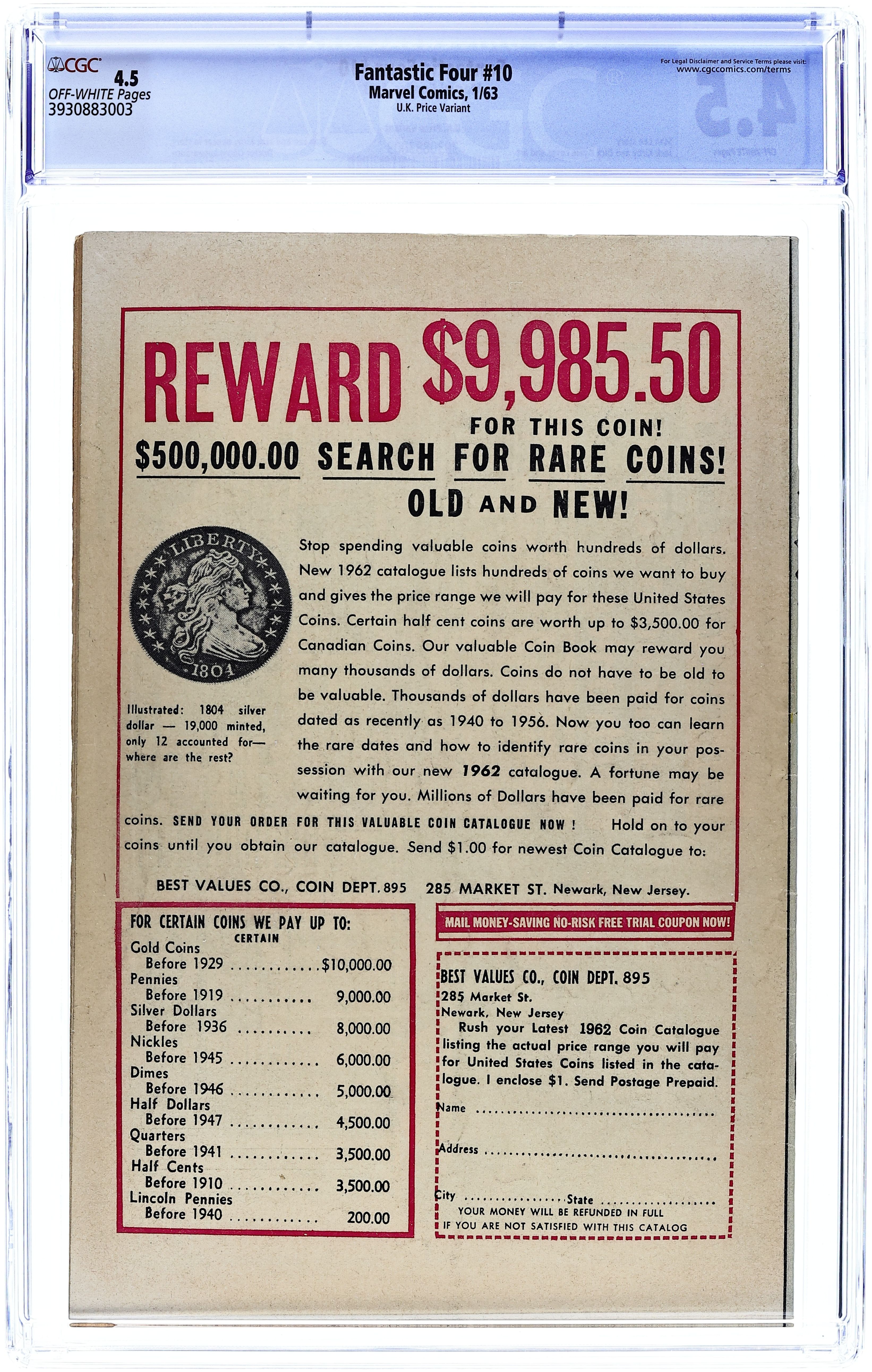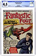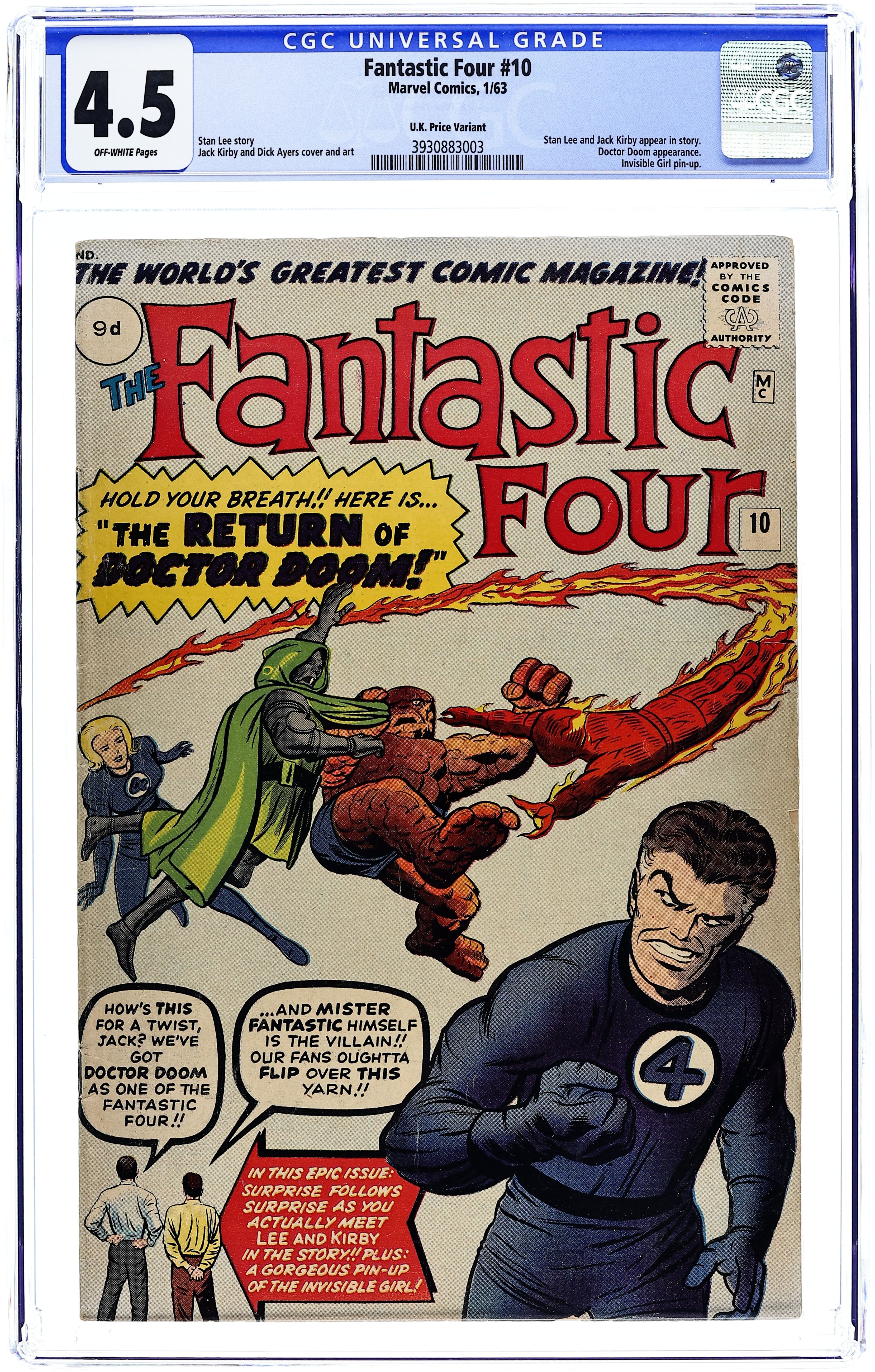 UK edition. Identical to US edition but has 9d cover price. Cover pencils by Jack Kirby, inks by Dick Ayers. Doctor Doom returns in the appropriately-named "The Return of Doctor Doom!", script by Stan Lee, pencils by Jack Kirby, inks by Dick Ayers; Doctor Doom returns from his unwanted journey in space and visits Jack Kirby and Stan Lee in order to make them set a trap for the Fantastic Four. The Invisible Girl pinup by Kirby and Ayers. Part 2 "Back from the Dead!"; Doctor Doom tells how he managed to return to Earth with the help of the Ovoids and then he changes bodies with Mr. Fantastic using Ovoid technology. Part 3 "The End of Mr. Fantastic?"; Doctor Doom convinces the rest of the Fantastic Four that he is Mr Fantastic. Part 4 "No Place to Turn!"; Doctor Doom (as Mr. Fantastic) displays his new shrinking-ray and Mr. Fantastic (in Doom's body) escapes his captivity in Doom's castle. Part 5 "The Real Doctor Doom!" Cameos by the Mole Man, the Miracle Man, the Skrulls, the Sub-Mariner, the Ant-Man, the Hulk, and Thor. Letter to the editor from Rocket's Blast editor G.B. Love. 36 pgs.