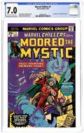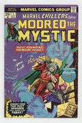 $10.00Cover pencils by Gil Kane, inks by Tom Palmer. 1st appearance of Modred the Mystic in "Magic is Alive!", script by Marv Wolfman (inspiration) and Bill Mantlo, pencils by Ed Hannigan (page 1) and Yong Montano, inks by John Romita (page 1), Frank Giacoia (page 1), and Yong Montano; Janet Lyton and Grant Whittacker dig a tunnel to try and find the lost tower of Darkhold in England; They work through a storm, which washes out the supports of their tunnel, causing it to cave ; In the adjoining chamber they find what they believe is a perfectly preserved human body in a tomb dating back to the Dark Ages; The man comes to life, revealing himself to be Mordred, a magician's apprentice during the final years of Camelot. Reprint back-up story "It Happened in the Attic!" (from Mystical Tales 7), art by Frank Bolle; A man goes back in time and kills his ancestor. 36 pgs., full color. $0.25. Cover price $0.25.