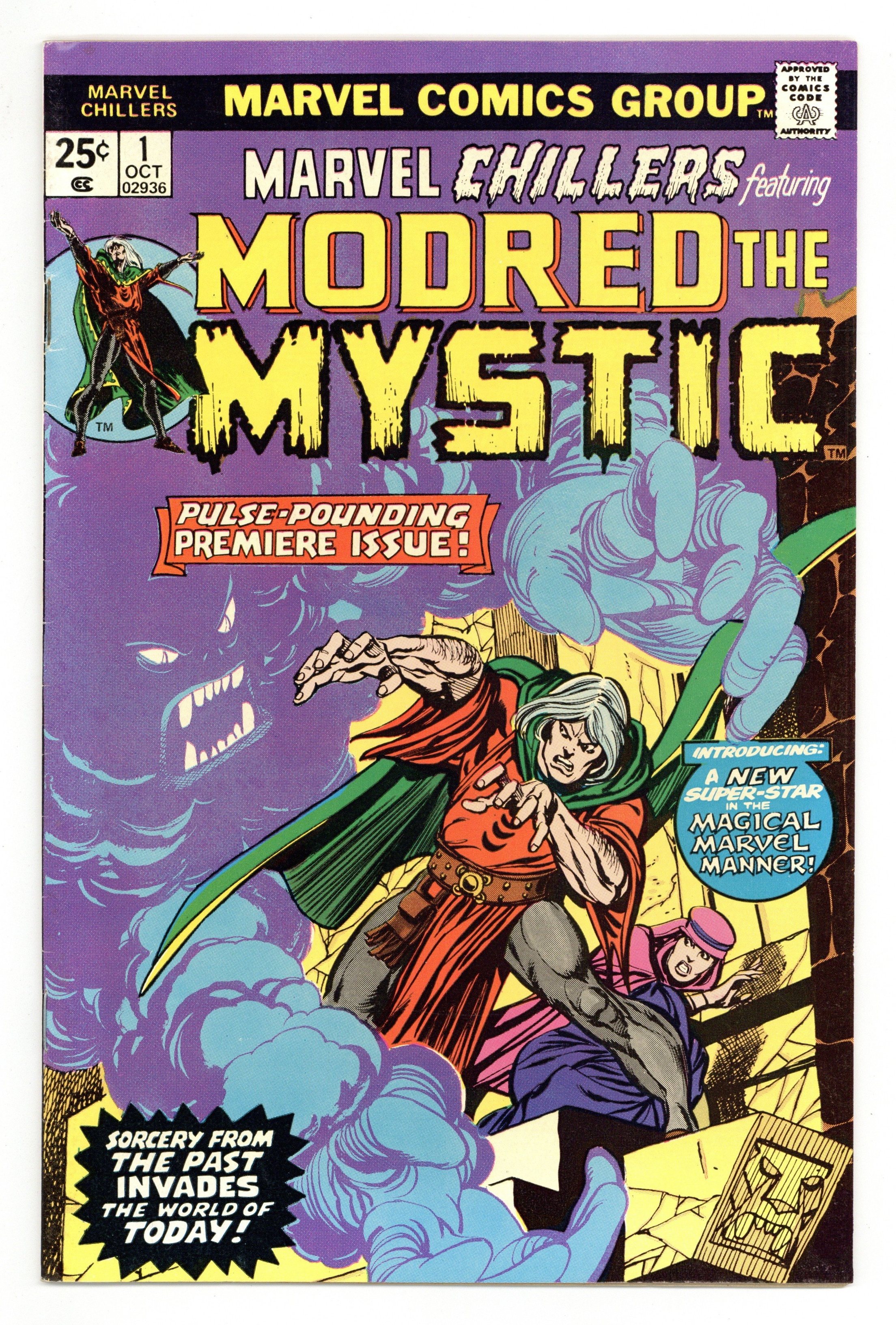 $5.50Cover pencils by Gil Kane, inks by Tom Palmer. 1st appearance of Modred the Mystic in "Magic is Alive!", script by Marv Wolfman (inspiration) and Bill Mantlo, pencils by Ed Hannigan (page 1) and Yong Montano, inks by John Romita (page 1), Frank Giacoia (page 1), and Yong Montano; Janet Lyton and Grant Whittacker dig a tunnel to try and find the lost tower of Darkhold in England; They work through a storm, which washes out the supports of their tunnel, causing it to cave ; In the adjoining chamber they find what they believe is a perfectly preserved human body in a tomb dating back to the Dark Ages; The man comes to life, revealing himself to be Mordred, a magician's apprentice during the final years of Camelot. Reprint back-up story "It Happened in the Attic!" (from Mystical Tales 7), art by Frank Bolle; A man goes back in time and kills his ancestor. 36 pgs., full color. $0.25. Cover price $0.25.