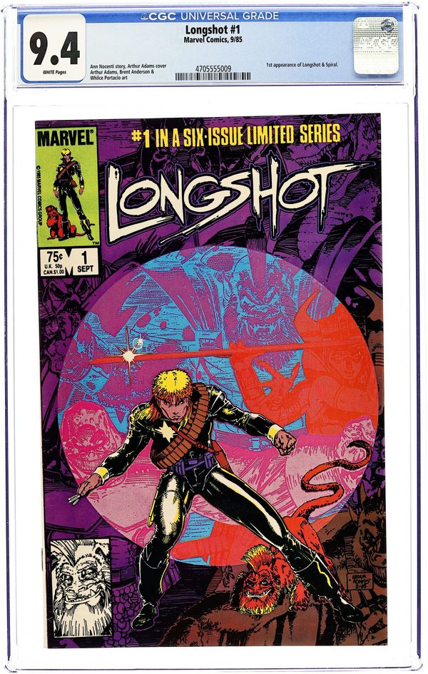 Tags: X-Men$20.00Direct Edition. 1st Art Adams pro work. Arriving on Earth unsure of his own identity, Longshot tries to rescue a kidnapped baby in "A Man Without a Past." Script by Ann Nocenti. Pencils by Arthur Adams (his first pro work). Inks by Whilce Portacio & Anderson. Cover by Adams. 1st appearance of Longshot and Spiral. Cover price $0.75.