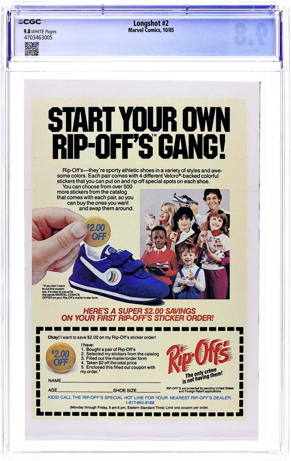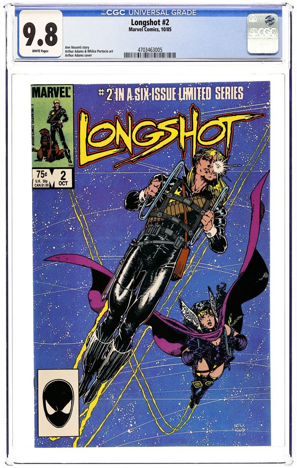 Written by Ann Nocenti. Art by Arthur Adams, Whilce Portacio, and Scott Williams. Cover by Arthur Adams. I'll Wave to You from the Top!; A director is impressed with Longshot's physical acrobatics and offers him a job as a stunt man; Longshot befriends Ricochet Rita, and the pair dazzle the cameras; Longshot is attacked by hunters from his home world and is rescued by Magog who is beginning to grow and transform into a more demonic looking creature; During filming, Longshot's luck powers desert him as the making of money is not considered a worthy goal and he is cut down by lasers; The director claims that he is going to rush Longshot to the hospital but ends up dumping him in a river and leaving him to die. 36 pgs., full color. $0.75. Cover price $0.75.