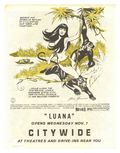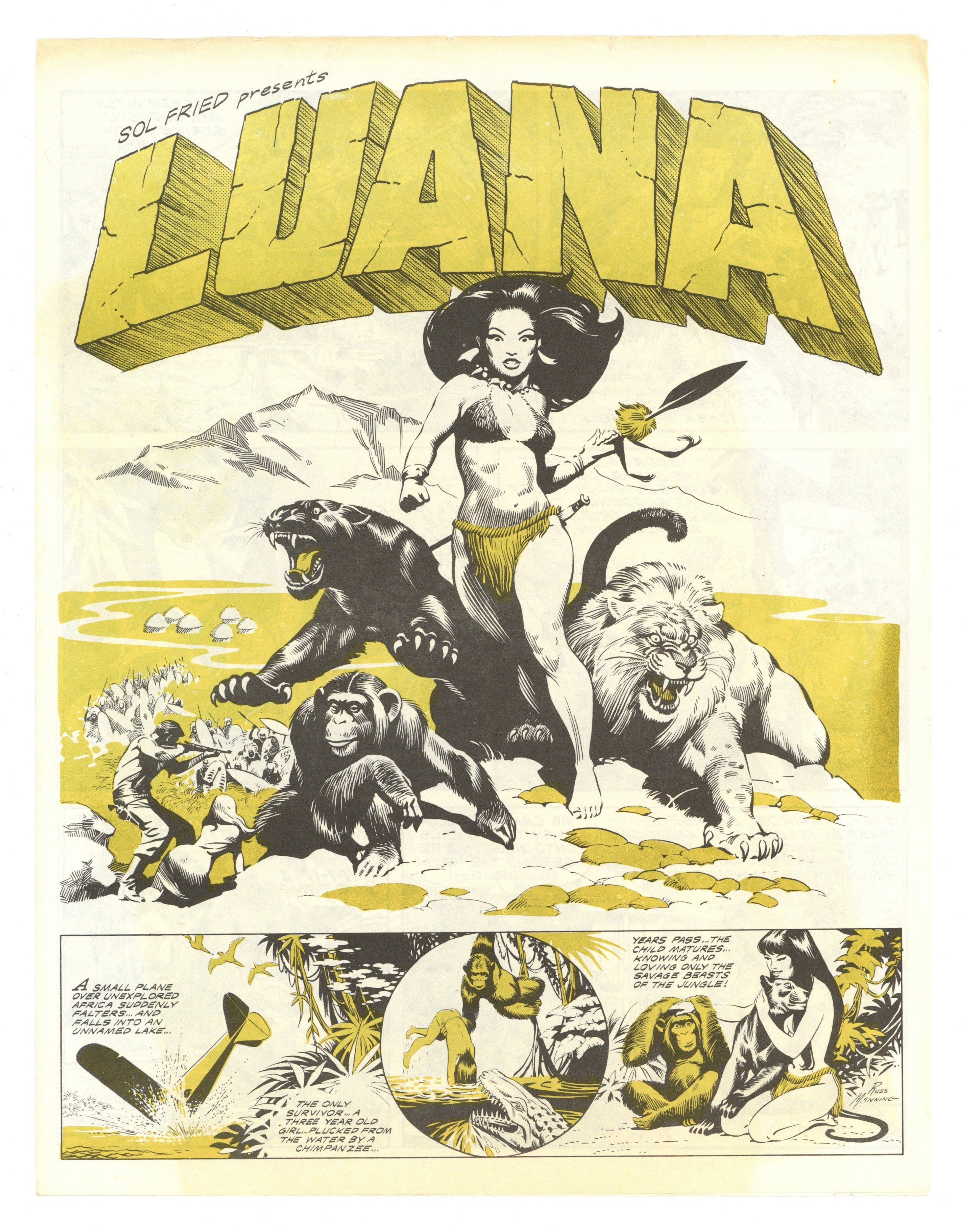 $53.00The Luana movie, produced by Sol Fried, had fan favorites Frank Frazetta and Russ Manning produce artwork to promote the movie. This promotional comic is by Russ Manning. He based the splash panel on Frazetta's movie poster art but the rest is all Manning after that. 8 1/2-in. x 11-in., 4 pages, single color added to covers, black and white interior.