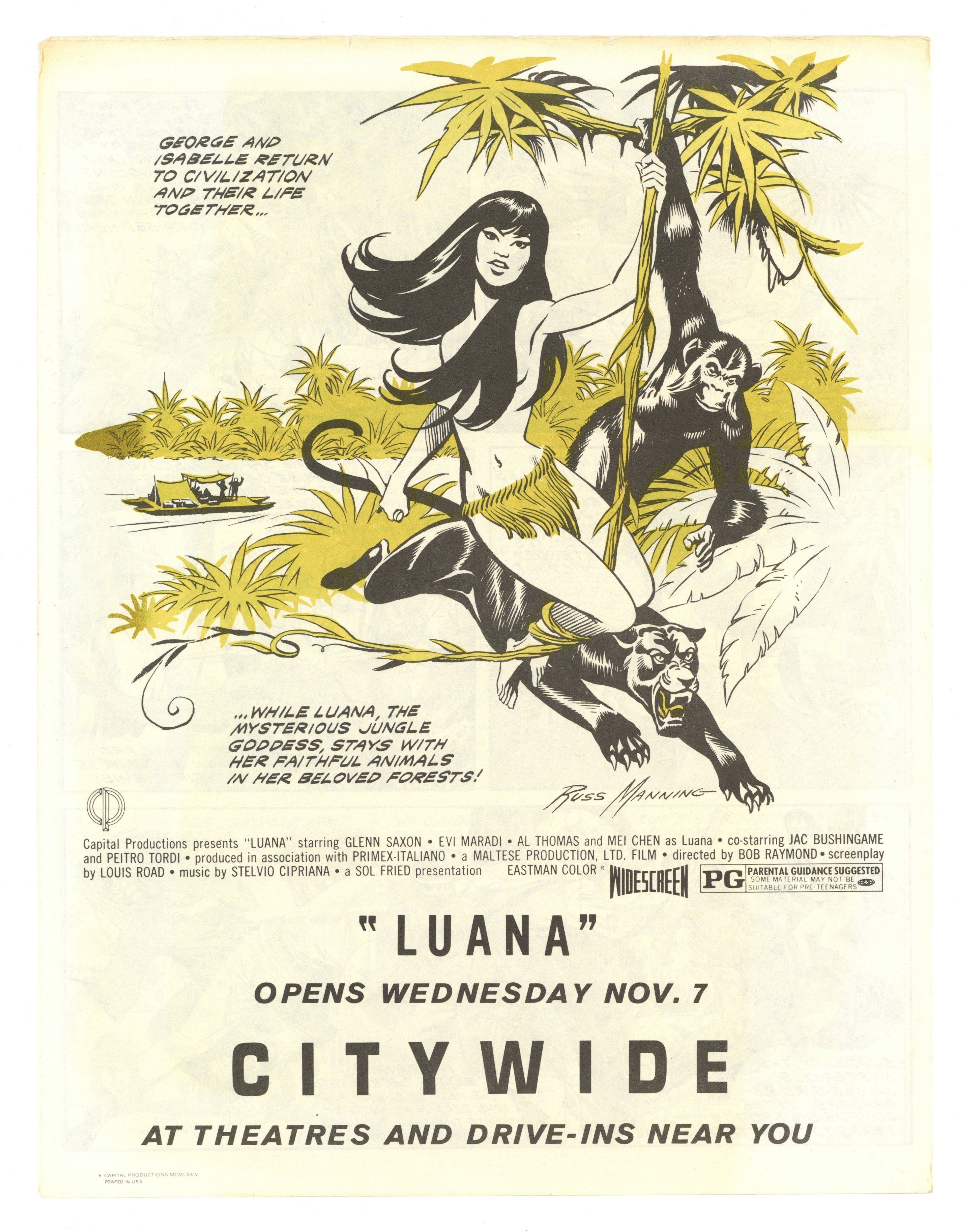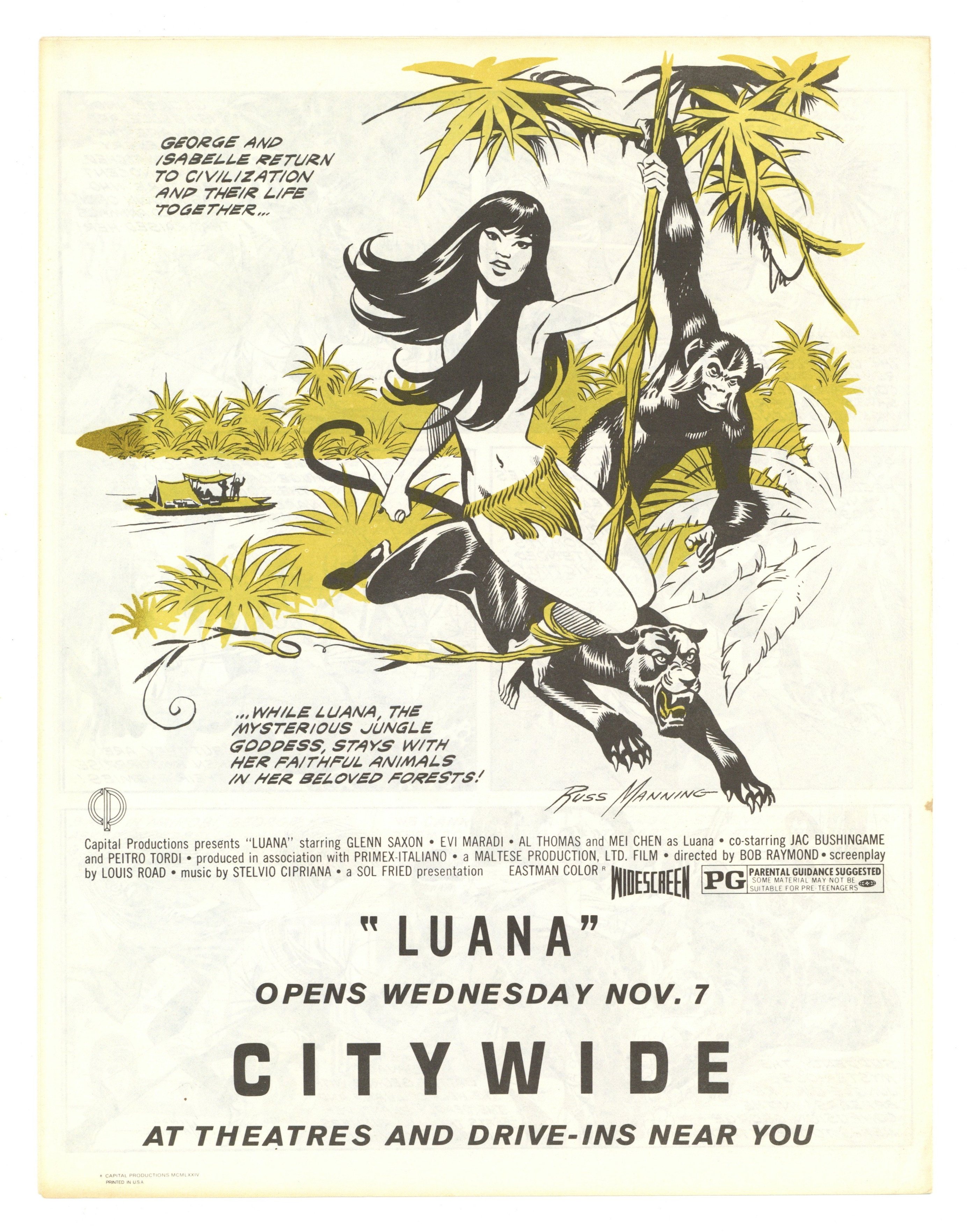 $45.00The Luana movie, produced by Sol Fried, had fan favorites Frank Frazetta and Russ Manning produce artwork to promote the movie. This promotional comic is by Russ Manning. He based the splash panel on Frazetta's movie poster art but the rest is all Manning after that. 8 1/2-in. x 11-in., 4 pages, single color added to covers, black and white interior.