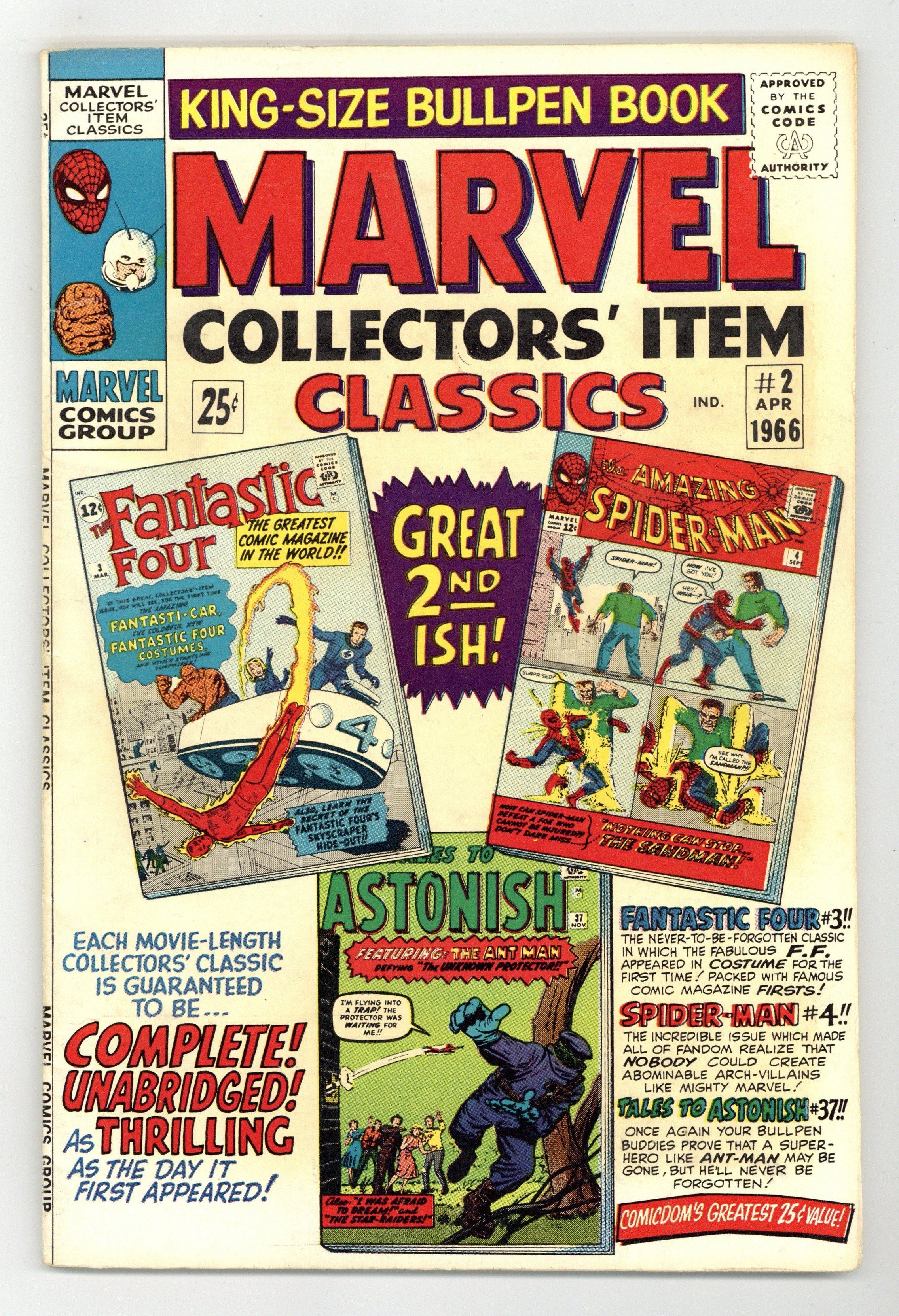Reprints Fantastic Four #3, Spider-Man #4, and Ant-Man from Tales to Astonish #37. Cover pencils by Jack Kirby (Fantastic Four, Tales to Astonish) and Steve Ditko (Spider-Man cover), inks by Sol Brodsky (Fantastic Four), Steve Ditko (Spider-Man), and Dick Ayers (Tales to Astonish). "The Menace of the Miracle Man," script by Stan Lee, pencils by Jack Kirby, inks by Sol Brodsky; The Miracle Man performs his super-villain debut at his magic show by humiliating the Thing; Miracle Man declares war on humanity and animates a movie monster statue; Human Torch torches the animated Monster from Mars statue and Invisible Girl stows away on the atomic tank that Miracle Man has stolen; The Thing recalls the origin of the Fantastic Four while the Invisible Girl is taken prisoner by Miracle Man. "Trapped by the Protector!", script by Stan Lee (plot) and Larry Lieber (script), pencils by Jack Kirby, inks by Dick Ayers; Ant-Man deals with a dangerous extortionist, who turns out to be disguised as one of the victimized jewelers. "Nothing Can Stop...the Sandman," script by Stan Lee, art by Steve Ditko; The Sandman tries to hide from police in the high school where Peter Parker goes to school. 68 pgs., full color. Cover price $0.25.
