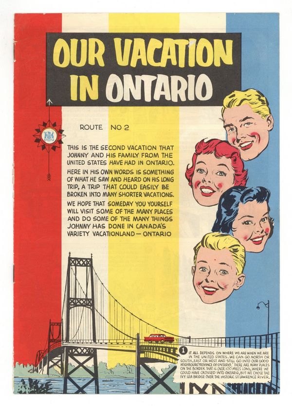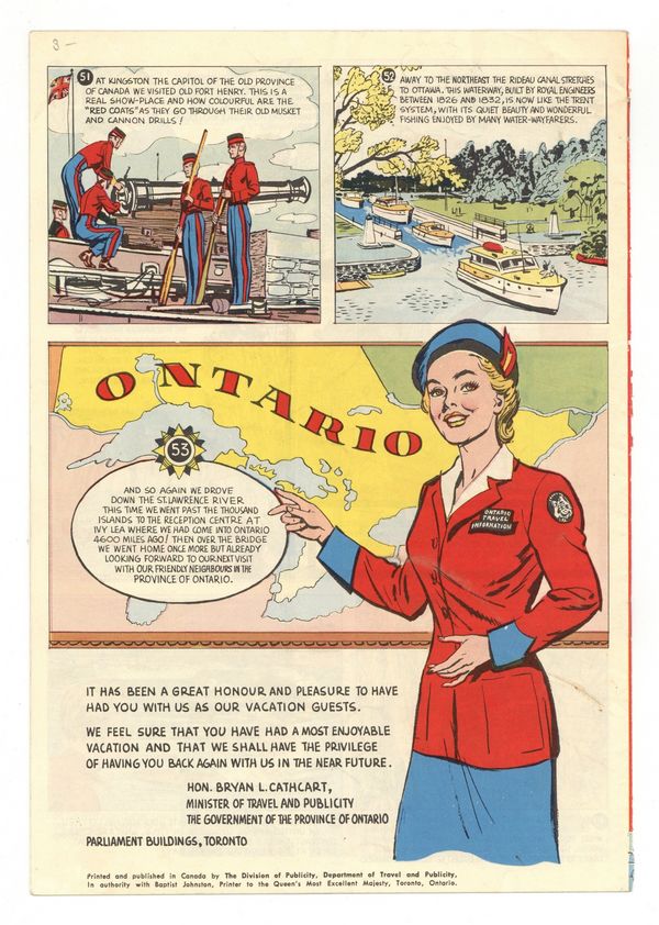 Published 1960 by Ontario Department of Travel and Publicity.$32.00Johnny and his family are back for their second vacation in Ontario, Canada this time visiting 53 points of interest presented in comic form including famous lakes, forts and even mines.