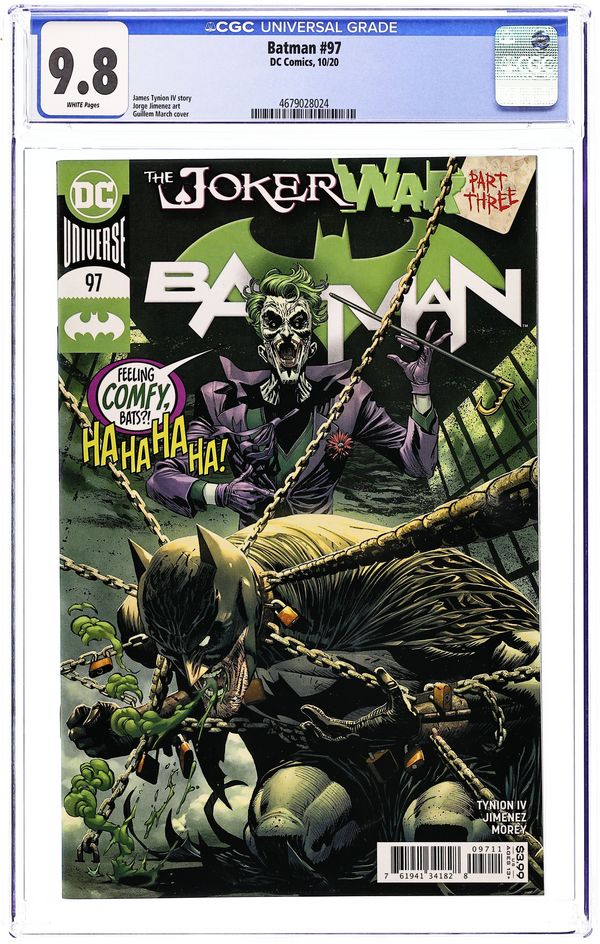 Joker War: Part 3 of 6 - Written by James Tynion IV. Art by Jorge Jimenez. Cover by Guillem March. The Joker's army is growing hour by hour, with weapons beyond anything the Clown Prince of Crime has ever used before. Batman must hold his mind together so he can strike the final blow and take back his city-but how can he heal the rifts he's created in his life to get the help he needs? And while all this is happening, the villains of Gotham City are waiting out the carnage Joker has unleashed-and Catwoman assembles an army of her own! 32 pages, full color. Rated T+ Cover price $3.99.