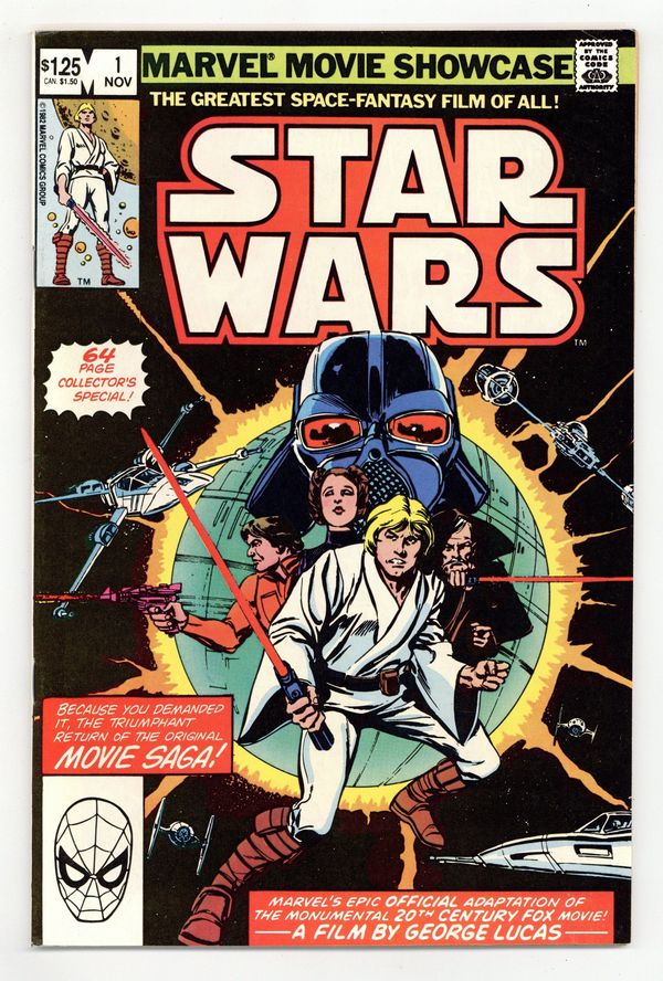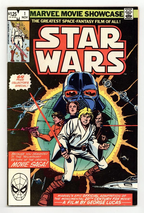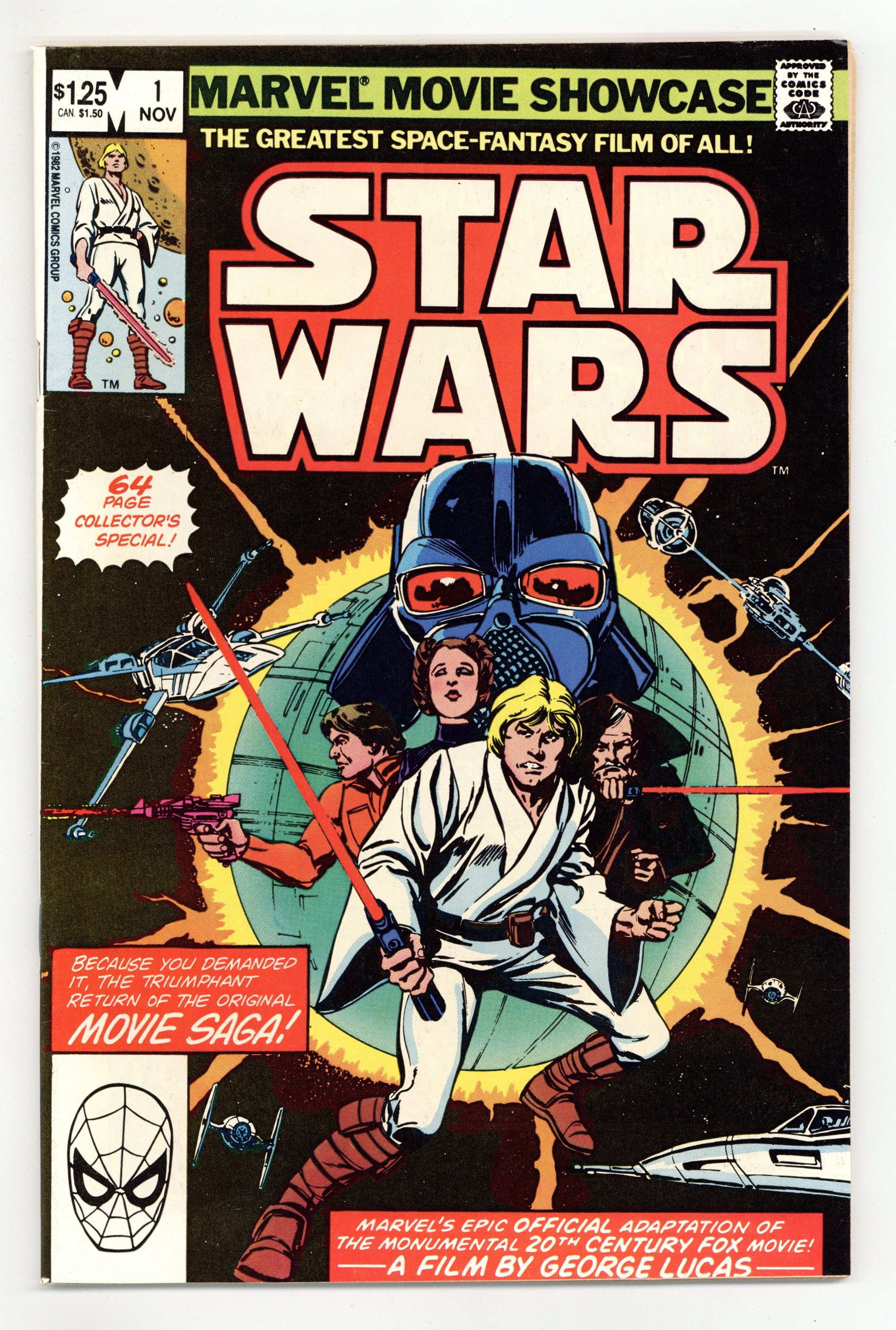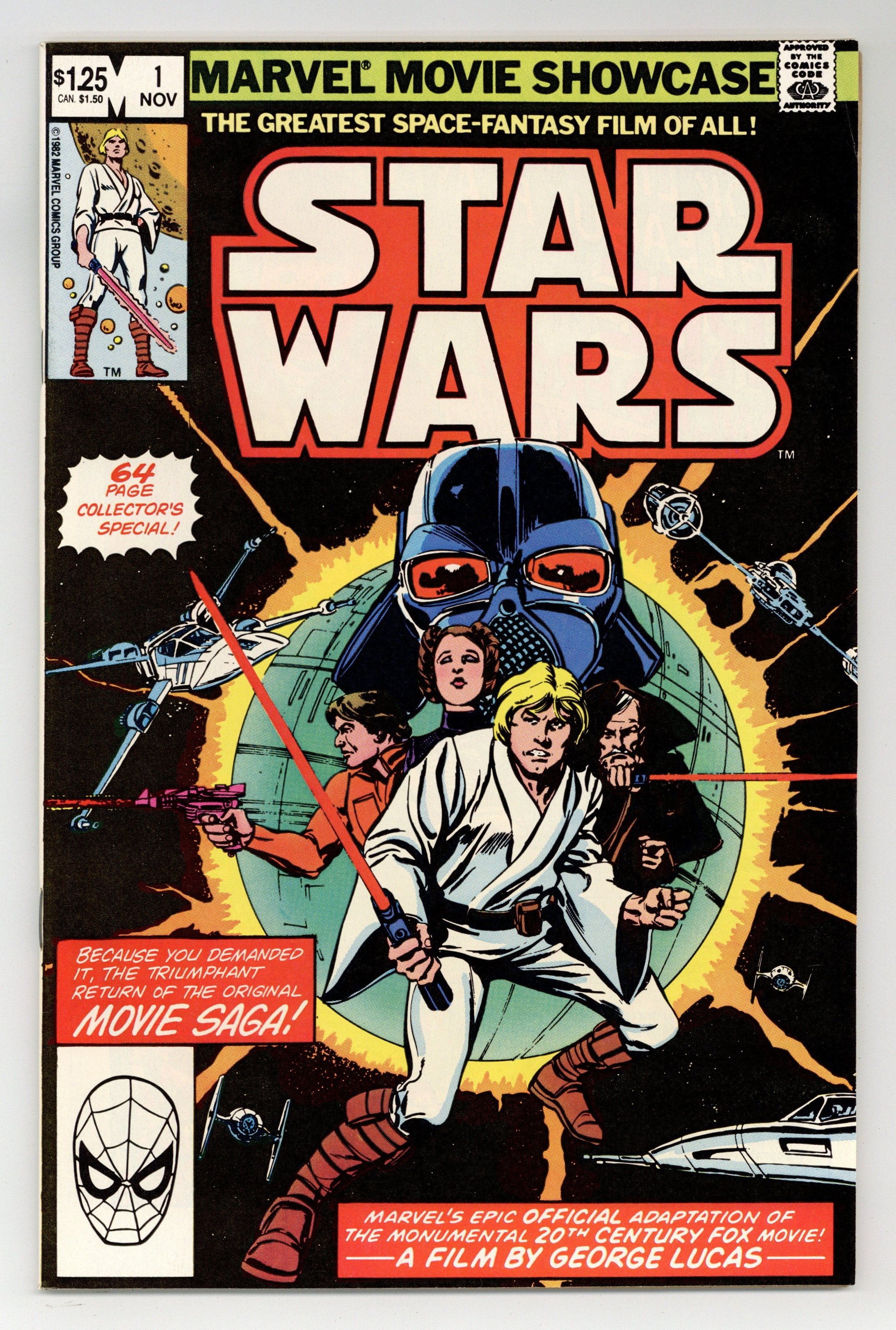 Direct Edition. "Star Wars!" Collects Star Wars (1977-1986 Marvel) #1-3. Based on the movie by George Lucas. Adapted by Roy Thomas. Art by Howard Chaykin. This is the official comic book adaptation of the greatest science fiction epic of all time. A long time ago, in a galaxy far, far away a small band of rebels fight desperately to free the galaxy from the evil rule of the sinister Galactic Empire. When a Princess is taken captive by the dark lord of the Sith, it falls upon a young farm boy, an old wise man, a smuggler and his giant wookie companion, and two droids to rescue her. Thus, begins the adventure of a lifetime! 64 pages, FC. Cover price $1.25.