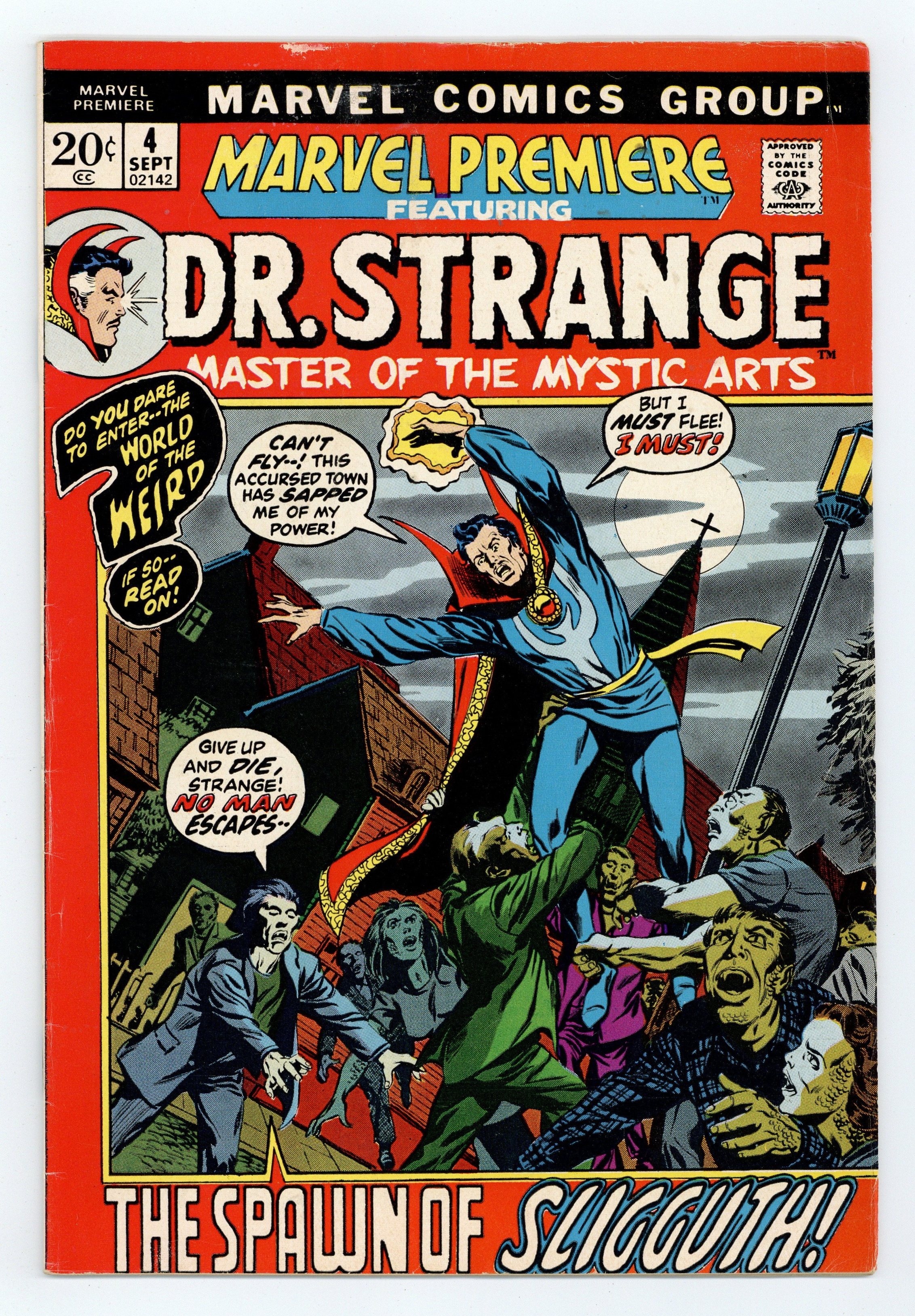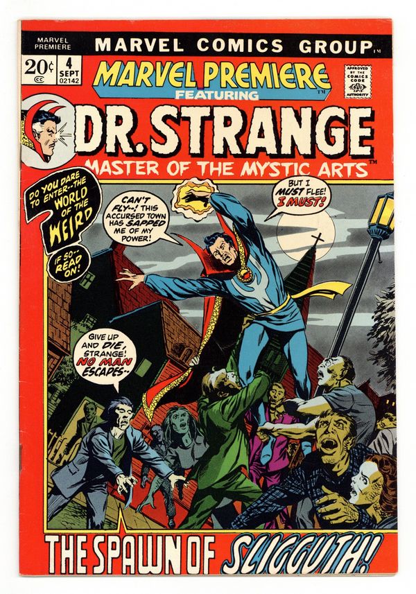 Cover pencils by Barry Smith, inks by Tom Palmer. The Spawn of Sligguth, script by Archie Goodwin and Roy Thomas (plot), pencils by Barry Smith, inks by Frank Brunner; Ethan Stoddard asks help for his fiancee who has fallen prey to the cult of Sligguth in Starksboro; The Ancient One warns Strange of a Cosmic Obscenity that slumbers; Strange is overcome by Sligguth's worshippers. Featuring concepts created by Robert E. Howard. 36 pgs. $0.20. Cover price $0.20.