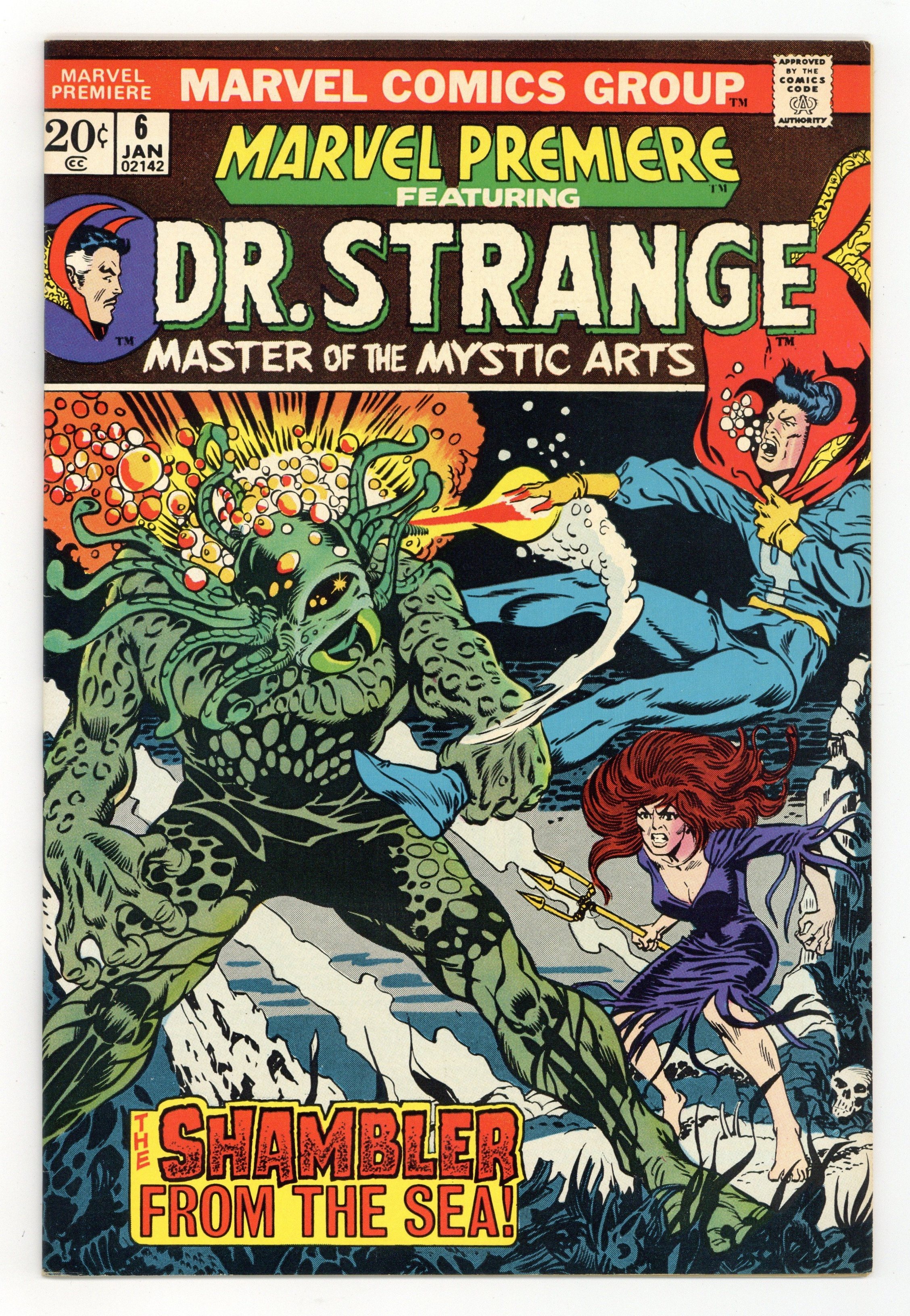 Cover art by Mike Ploog and Frank Giacoia (alterations). The Shambler from the Sea, script by Gardner F. Fox, pencils by Frank Brunner, inks by Sal Buscema; Strange kills Sligguth, which wakens Shambler from the Sea, N'Gabthoth; Clea and Wong are overcome by Starksboro cult; Strange frees them from sacrifice to N'Gabthoth, and discovers map of Stonehenge. Featuring concepts created by Robert E. Howard. Comics ad for the NBC Saturday morning kid shows: Kids [Adam; Evy]; the Barkleys; the Houndcats; the Jetsons; the Pink Panther; the Roman Holidays; and Underdog. 36 pgs. $0.20. Cover price $0.20.