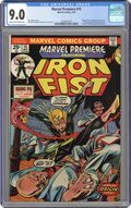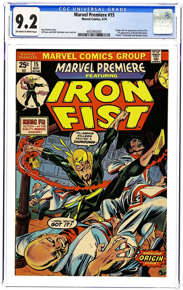 Tags: Martial Arts$135.00First 25-cent cover price. Origin and first appearance of Iron Fist in The Fury of Iron Fist!, script by Roy Thomas, pencils by Gil Kane, inks by Dick Giordano; Iron Fist passes the final tests in his K'un-Lun training and is granted the privilege of immortality if he so chooses; During his final battle with the robot Shu-Hu, Danny remembers how his father was killed by Meachum and his mother gave her life to save his as the Rand family searched for the fabled city of K'un-Lun. The letters page contains Marvel Value Stamp series A # 94 (Electro by Steve Ditko). Text article explaining price hike to 25 cents for Marvel's 36-page comics, followed by short editorial by Roy Thomas detailing genesis of Iron Fist. 36 pgs. $0.25. Cover price $0.25.